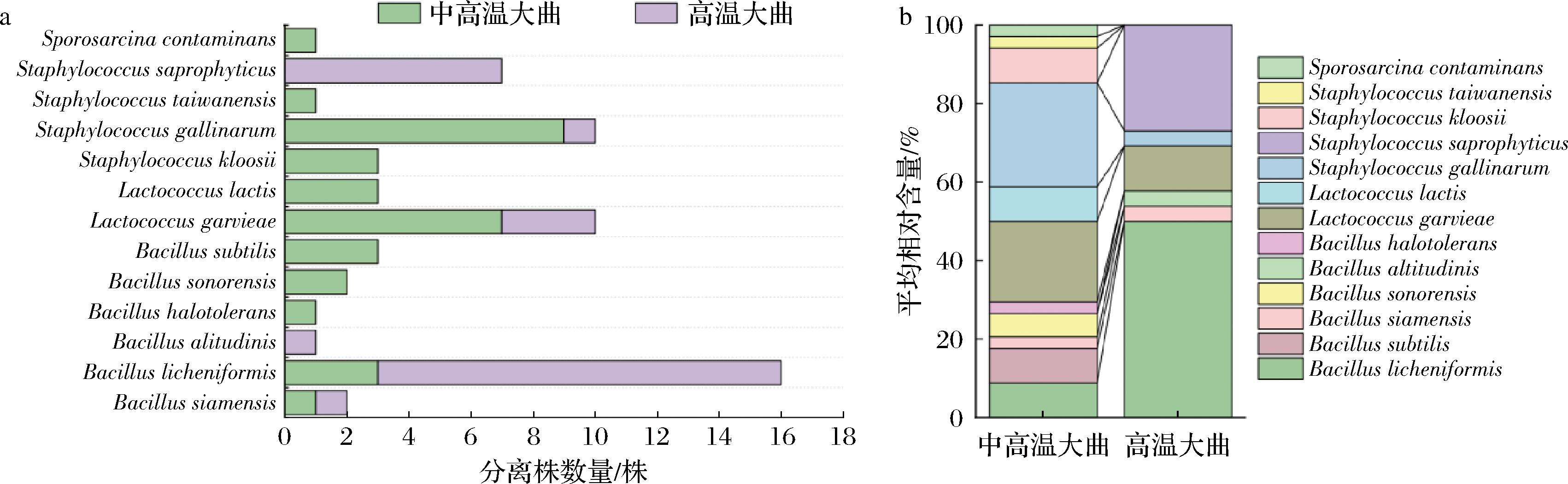 a-分离株物种多样性分析;b-中高温和高温大曲可培养细菌多样性分析