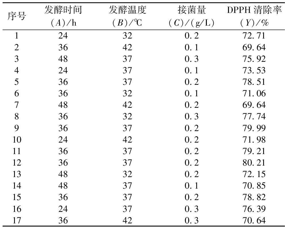 序号发酵时间(A)/h发酵温度(B)/℃接菌量(C)/(g/L)DPPH清除率(Y)/%124320.272.71236420.169.64348370.375.92424370.173.53536370.278.51636320.171.06748420.269.64836320.377.74936370.279.991024420.271.981136370.279.211236370.280.211348320.272.151448370.170.851536370.278.821624370.376.391736420.370.64