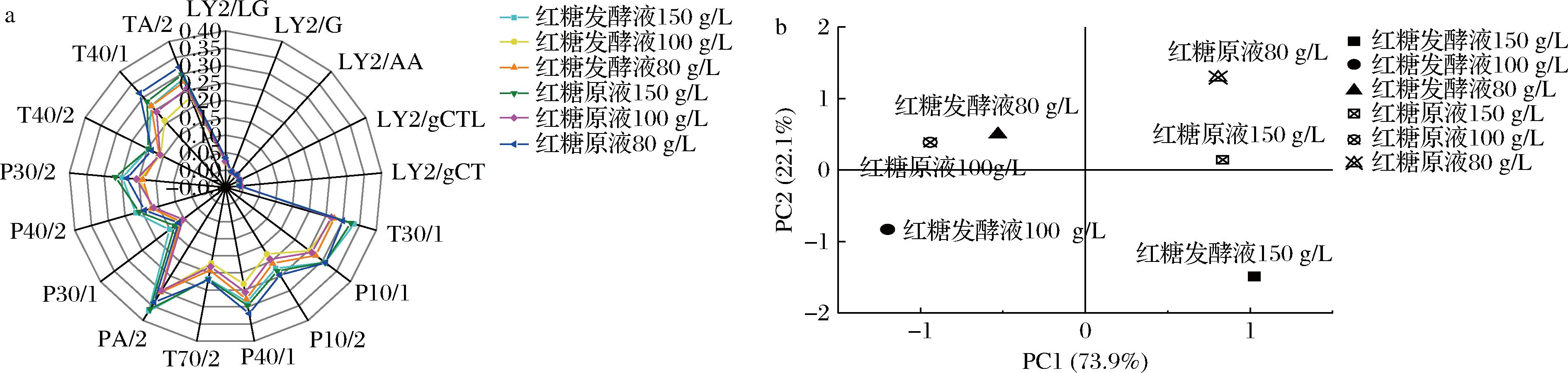 不同稀释度发酵红糖液与未发酵红糖原液电子鼻主成分分析结果见图3-b,第1主成分贡献率为73.9%,第2主成分贡献率为22.1%,2个主成分累计贡献率96.0%,超过85%,可以反映多指标信息。在第1主成分上,80、100 g/L的发酵红糖液与150 g/L的发酵红糖液可以很好区分,说明150 g/L的发酵红糖液与前两者风味区别明显。在第2主成分上,80 g/L的发酵红糖液与100 g/L的发酵红糖液存在差异,说明这2个稀释度的发酵红糖液之间风味也有明显区别,与上述雷达图结果一致。此外,80、100、150 g/L这3个稀释度的发酵红糖液与未发酵原液分别在第1主成分、第2主成分、第2主成分上区别明显,再次说明了微生物发酵对红糖液风味产生了影响。