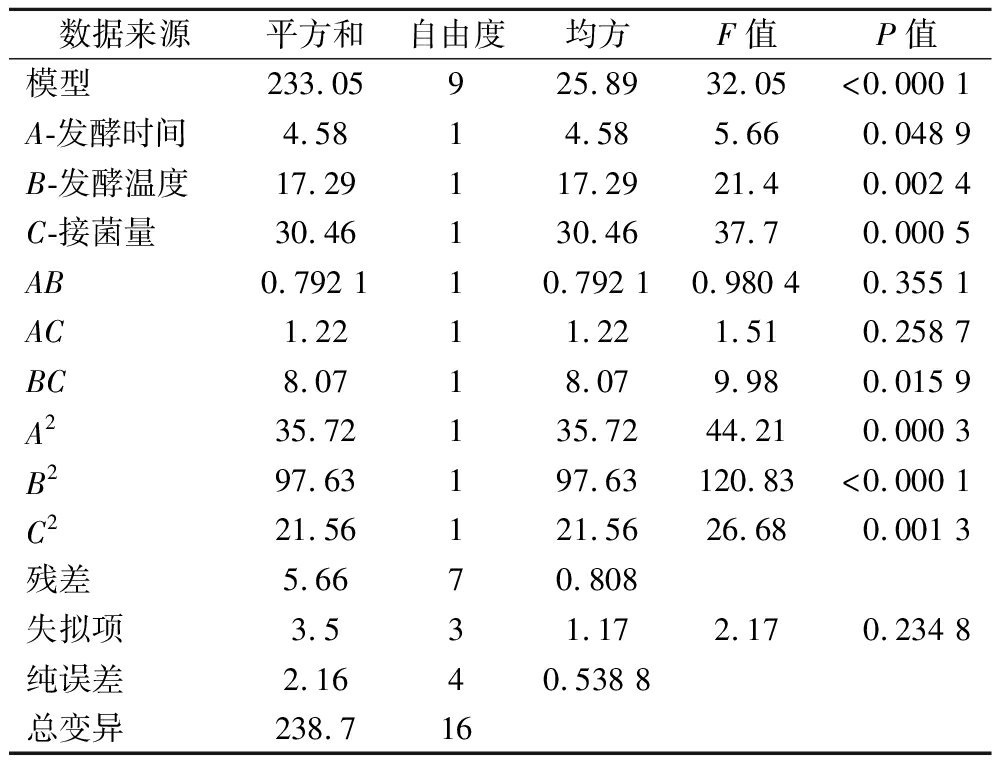 数据来源平方和自由度均方F值P值模型233.05925.8932.05<0.000 1A-发酵时间4.5814.585.660.048 9B-发酵温度17.29117.2921.40.002 4C-接菌量30.46130.4637.70.000 5AB0.792 110.792 10.980 40.355 1AC1.2211.221.510.258 7BC8.0718.079.980.015 9A235.72135.7244.210.000 3B297.63197.63120.83<0.000 1C221.56121.5626.680.001 3残差5.6670.808失拟项3.531.172.170.234 8纯误差2.1640.538 8总变异238.716