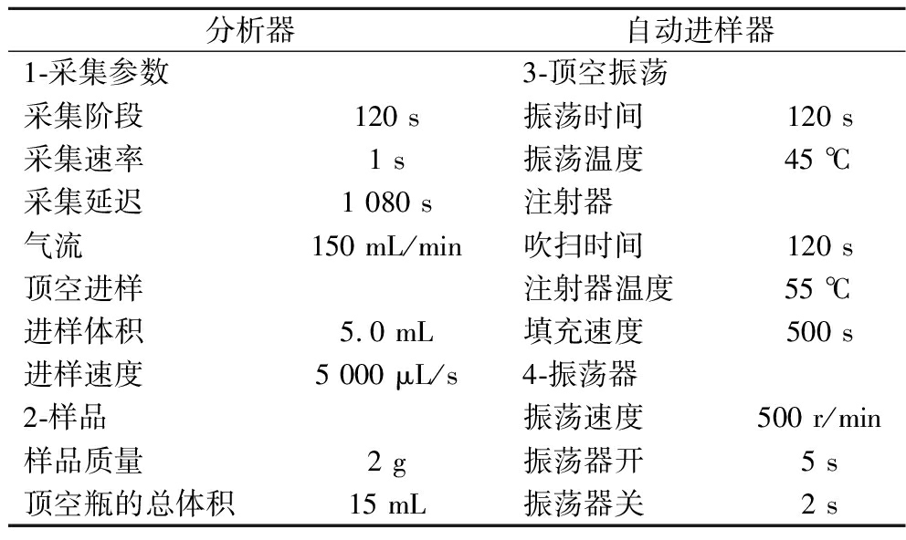 分析器自动进样器1-采集参数3-顶空振荡采集阶段120 s振荡时间120 s采集速率1 s振荡温度45 ℃采集延迟1 080 s注射器气流150 mL/min吹扫时间120 s顶空进样注射器温度55 ℃进样体积5.0 mL填充速度500 s进样速度5 000 μL/s4-振荡器2-样品振荡速度500 r/min样品质量2 g振荡器开5 s顶空瓶的总体积15 mL振荡器关2 s