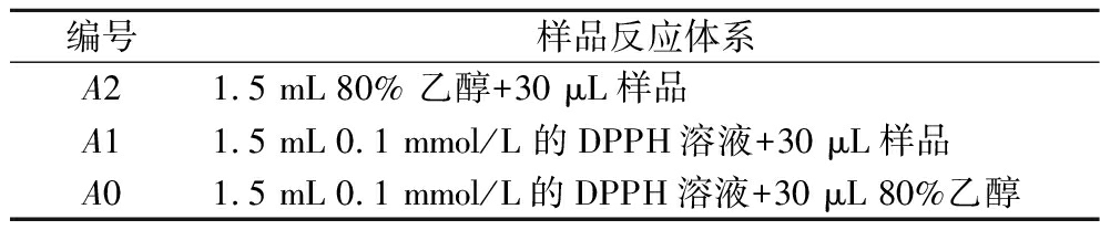 编号样品反应体系A21.5 mL 80% 乙醇+30 μL样品A11.5 mL 0.1 mmol/L 的DPPH溶液+30 μL样品A01.5 mL 0.1 mmol/L的DPPH溶液+30 μL 80%乙醇