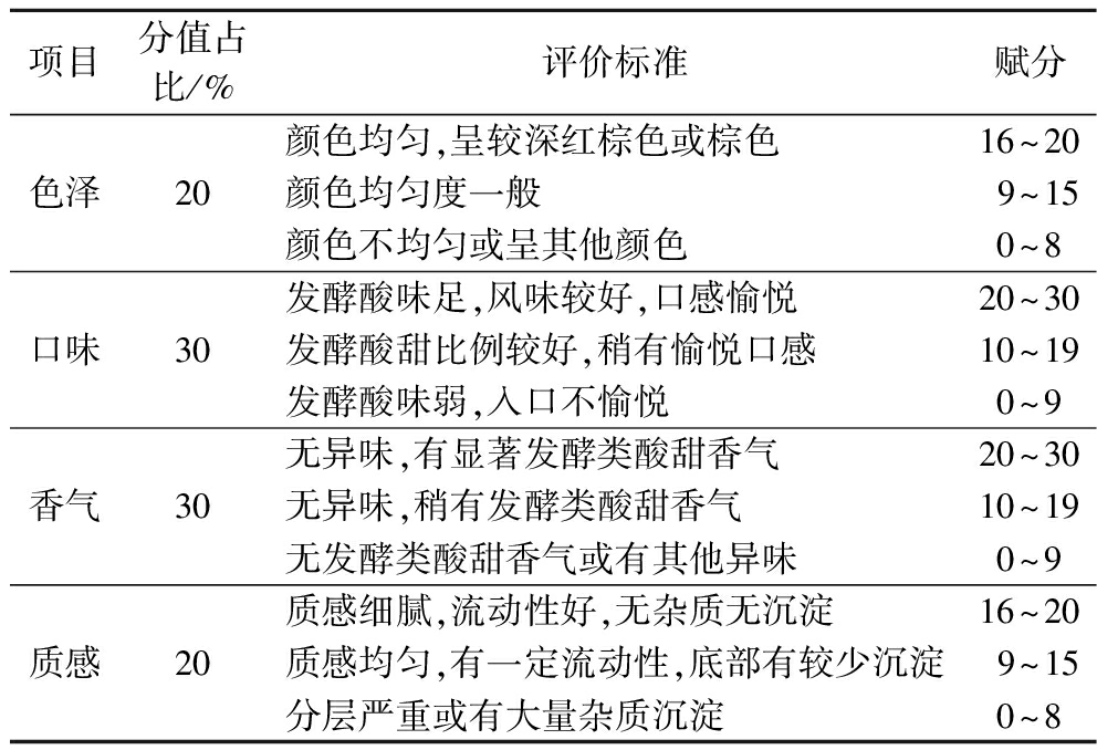 项目分值占比/%评价标准赋分色泽20颜色均匀,呈较深红棕色或棕色16~20颜色均匀度一般9~15颜色不均匀或呈其他颜色0~8口味30发酵酸味足,风味较好,口感愉悦20~30发酵酸甜比例较好,稍有愉悦口感10~19发酵酸味弱,入口不愉悦0~9香气30无异味,有显著发酵类酸甜香气20~30无异味,稍有发酵类酸甜香气10~19无发酵类酸甜香气或有其他异味0~9质感20质感细腻,流动性好,无杂质无沉淀16~20质感均匀,有一定流动性,底部有较少沉淀9~15分层严重或有大量杂质沉淀0~8
