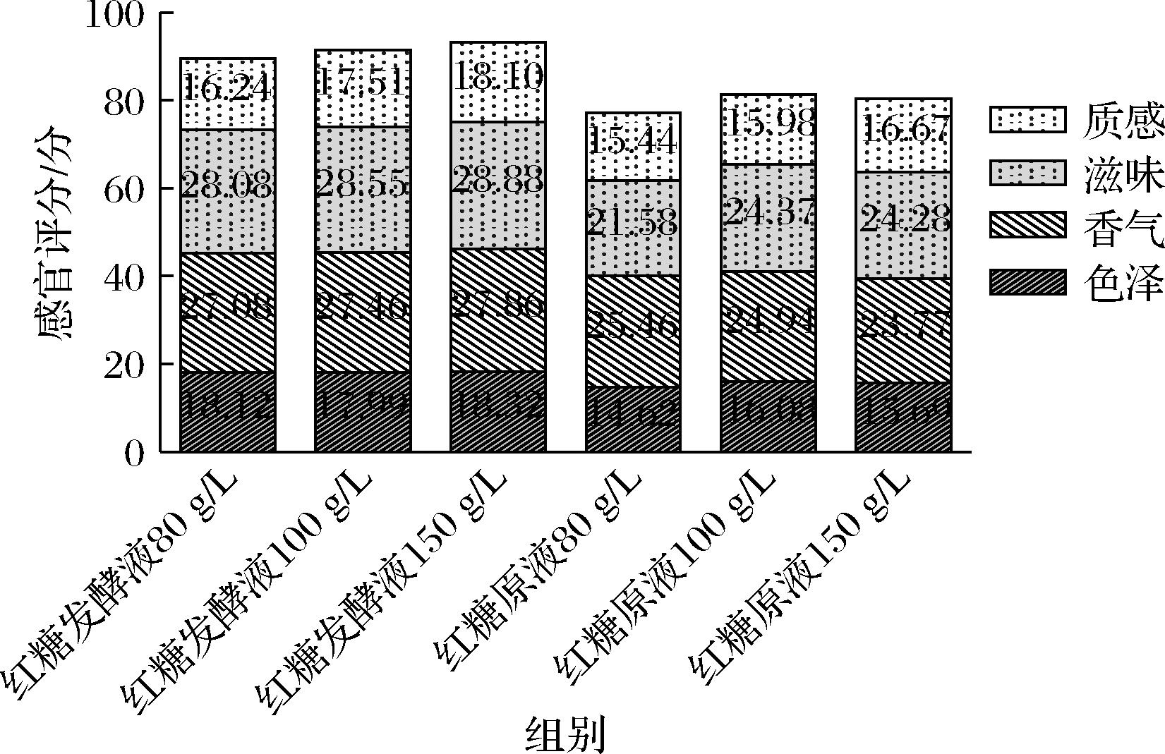 如图5所示,发酵红糖液得分均高于未发酵红糖原液,说明乳酸菌发酵有利于改善红糖感官特性。此外,80 g/L的未发酵红糖原液在色泽、滋味、质感3个方面得分最低,150 g/L的未发酵红糖原液在香气方面得分最低。150 g/L的发酵红糖液在色泽、香气、滋味、质感4个维度上得分均为最高,因此红糖发酵液的最佳稀释度为150 g/L。