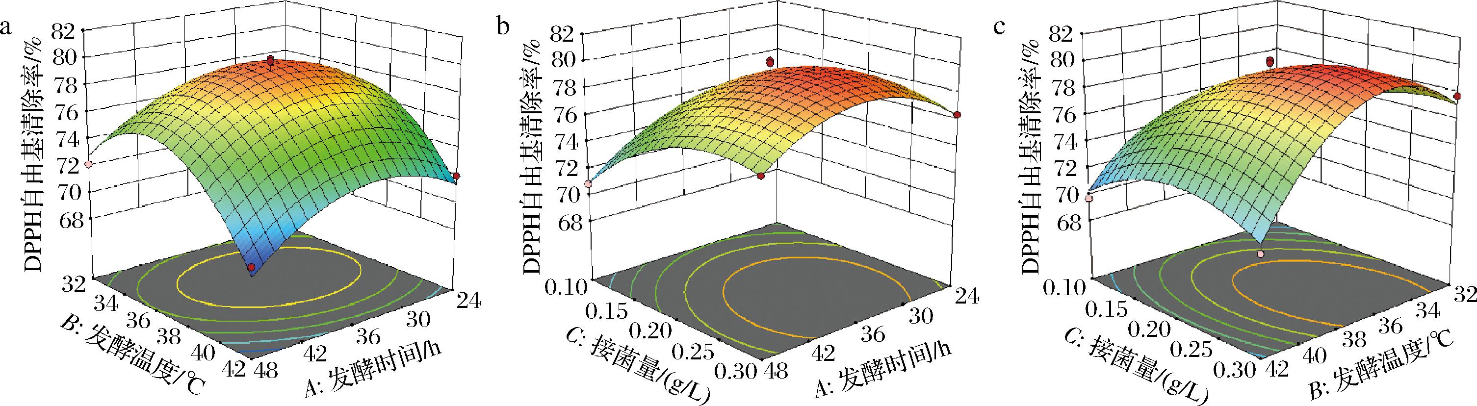 说明该模型能够较好地模拟红糖液体发酵工艺。由P值可以看出,一次项A、B、C,交互项AB、AC、BC,二次项A2、B2、C2对结果的影响中,一次项A、交互项BC达到显著水平(P<0.05),一次项B、C与二次项A2、B2、C2均达到了极显著水平(P<0.01),交互项AB、AC对结果影响不显著(P>0.05);由F值可以看出,各因素对DPPH自由基清除率的影响大小顺序为C>B>A。