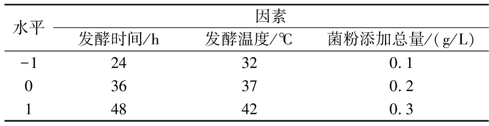 水平因素发酵时间/h发酵温度/℃菌粉添加总量/(g/L)-124320.1036370.2148420.3