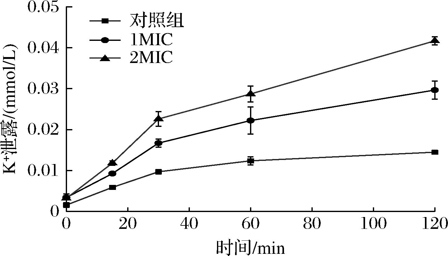 去极化导致细胞膜受损,通透性增加,细胞内离子泄漏,严重时,细胞内的大分子物质也会渗漏[18]。如图3所示,随着处理时间的延长,所有样品K+外泄量均有所增加。对照组的K+摩尔浓度在30 min后趋于平稳,在120 min达到0.014 5 mmol/L。相比之下,百里香酚处理组的K+摩尔浓度随百里香酚质量浓度增高而显著上升(P<0.05),1 MIC和2 MIC组在120 min时K+摩尔浓度分别为0.029 7、0.041 7 mmol/L,显著高于对照组(P<0.05)。YAMMINE等[19]的研究表明,百里香酚能破坏肠炎沙门氏菌的细胞膜,引起K+的大量泄漏。在125 mg/L百里香酚下,细胞外K+摩尔浓度随时间增加,在1 h后达到0.051 mmol/L。