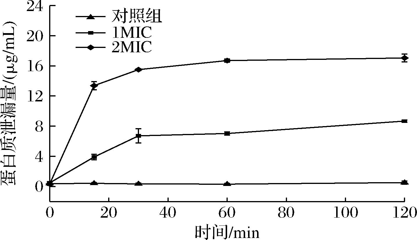 如图4所示,对照组的蛋白质质量浓度在实验过程中无显著变化(P>0.05),而样品组渗漏量随着百里香酚质量浓度和处理时间的增加而上升。1 MIC和2 MIC组在20 min内迅速增加,30 min后增幅趋缓,在120 min分别达到8.676、17.044 μg/mL,显著高于对照组(P<0.05)。结果表明,百里香酚通过破坏细胞膜的功能和结构,增加膜的通透性,促使细胞内K+和蛋白质的泄漏,最终导致细菌死亡。