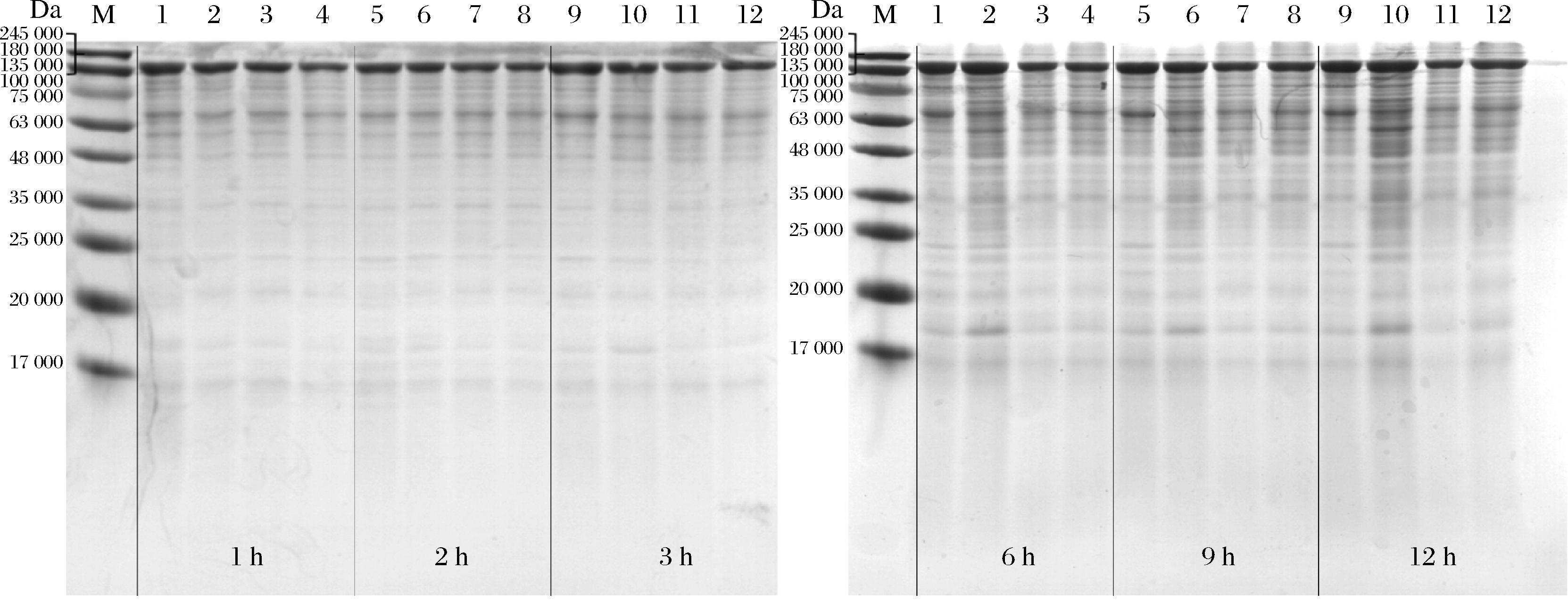 参考CHANG等[14]的方法测定。1.3.3节配制的菌悬液28 ℃下培养1、2、3、6、9、12 h。以8 000 r/min离心10 min后,沉淀用PBS洗涤3次,无菌生理盐水重悬。10 μL的样品中加入4倍体积的上样缓冲液,95 ℃水浴10 min。取10 μL样品上样于5%(体积分数)堆积凝胶和15%(体积分数)分离凝胶,以110 V电泳30 min后,升至150 V电泳2 h。考马斯亮蓝R-250染色,用10%(体积分数)乙酸、20%(体积分数)甲醇的溶液脱色,用凝胶成像仪进行观察。