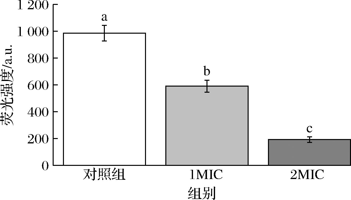对于正常细胞来说,膜电位的稳定维持是细胞膜结构完整性的关键指标[17]。百里香酚处理对P.fluorescens膜电位的影响如图2所示,对照组的荧光强度为9.845×102,1 MIC组和2 MIC组的荧光强度分别为5.904×102和1.927×102,均显著低于对照组(P<0.05),分别降低了40%和80%。结果表明,百里香酚能够有效破坏细胞膜的电位平衡,去极化现象随质量浓度的增高而更加明显。这一结果可能与百里香酚对细胞膜通透性的影响有关。膜电位的去极化通常意味着细胞膜表面电荷的紊乱,细胞膜的完整性和选择性通透性遭到破坏,从而导致内外离子的交换失控,细胞膜功能受损[14]。TIAN等[18]也观察到百里香酚对其他细菌细胞膜的去极化作用。因此,百里香酚对P.fluorescens膜电位的去极化效应,表明其可能通过改变膜的通透性,打破内外离子平衡,最终导致细胞膜功能的损害。
