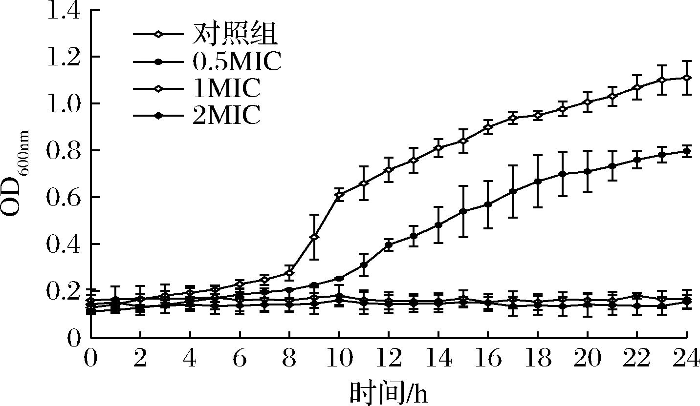 如图1所示,百里香酚处理抑制了P.fluorescens的生长,抗菌活性随着百里香酚质量浓度增加而增强。与对照组相比,当质量浓度为0.5 MIC时,可抑制P.fluorescens的生长,对数生长期消失。当百里香酚质量浓度超过1 MIC时,P.fluorescens的生长几乎完全停止。