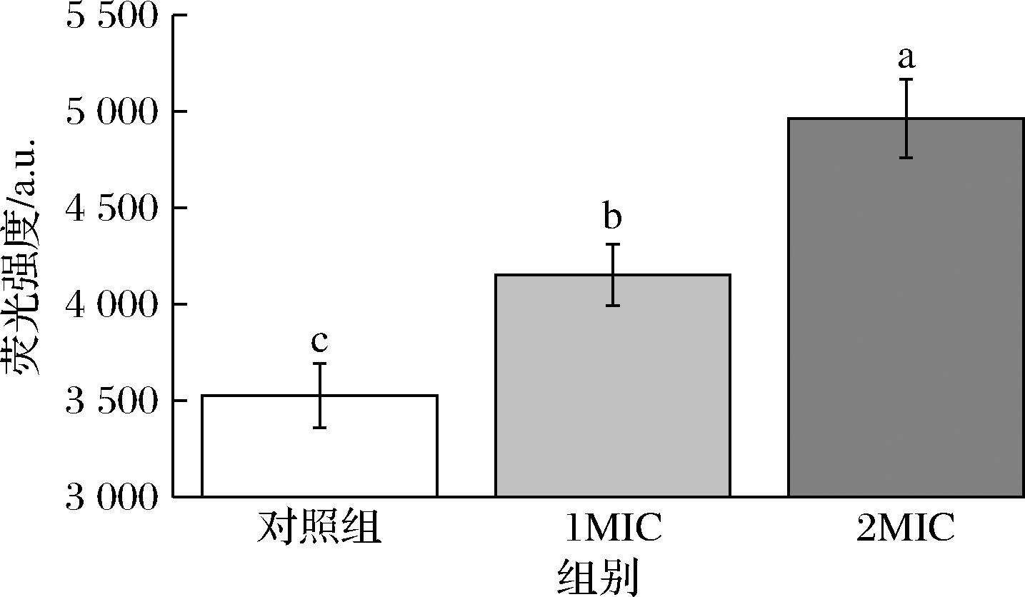 ROS的积累是细胞凋亡的关键指标之一,能直接损伤大分子,破坏细胞膜及呼吸过程中的电子传递链,导致细胞死亡[17]。细胞ROS含量与DCFH-DA荧光强度成正比,如图6所示,1 MIC和2 MIC组的荧光强度相对于对照组的3.526×103分别显著上升至4.155×103和4.963×103(P<0.05),表明细胞内部ROS水平显著升高(P<0.05)。LIU等[10]的研究发现62.5、125 mg/L的百里香酚质量浓度处理铜绿假单胞菌时,ROS水平从对照组的3.8×104上升至4.8×104和5.4×104,也证明了百里香酚能够诱导ROS的积累,进一步对脂质和细胞膜造成氧化损伤,影响细胞膜的正常功能,最终导致细胞膜破裂[22]。