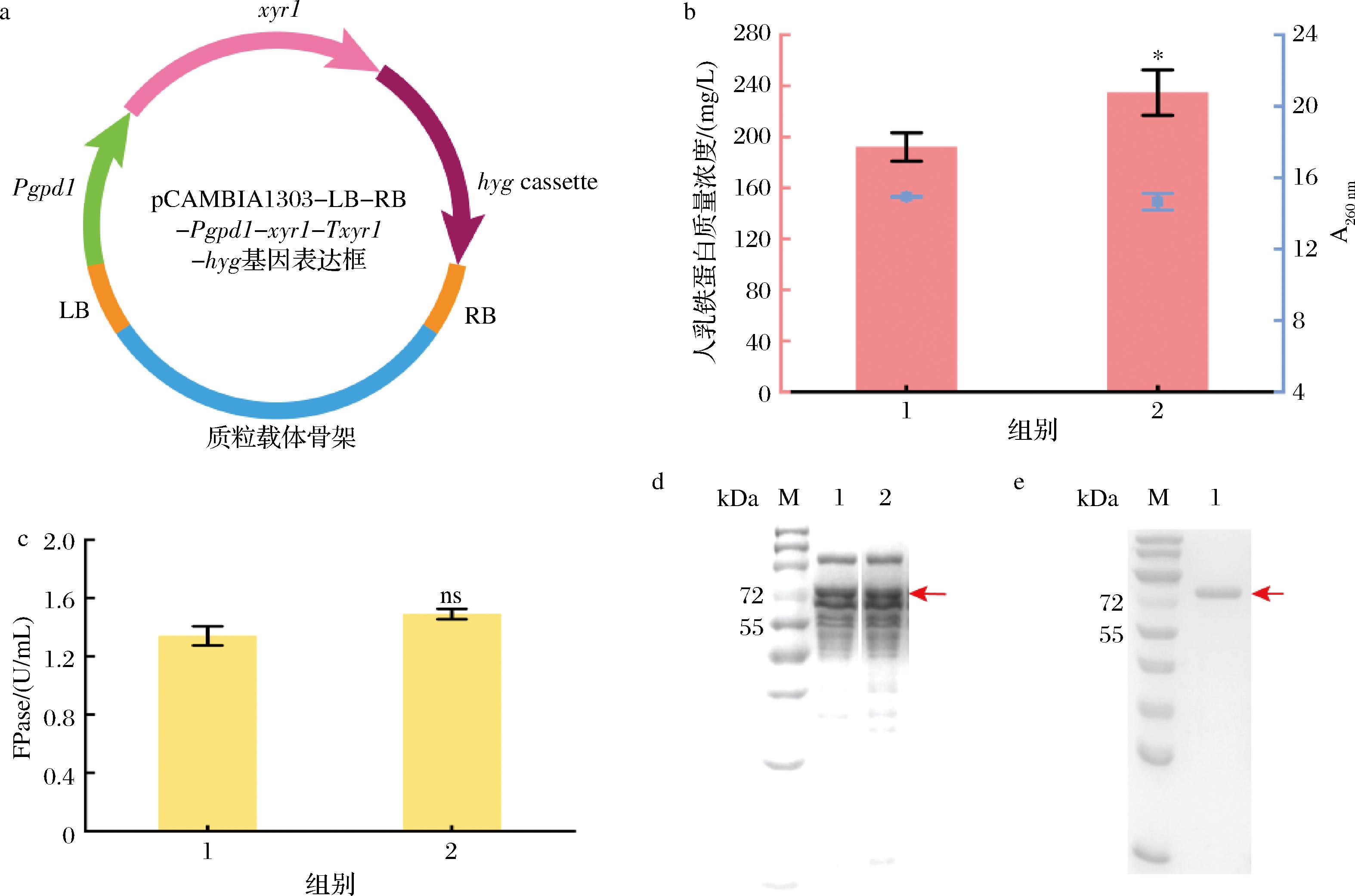 a-过表达xyr1基因质粒构建示意图;b-重组人乳铁蛋白的生产;c-纤维素滤纸酶活力;d-过表达xyr1基因后SDS-PAGE分析;e-标准重组人乳铁蛋白SDS-PAGE分析