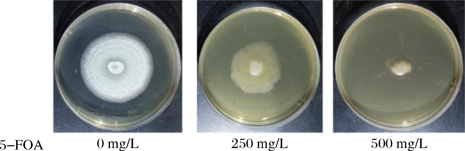 pyr4基因自身作为筛选标记,当T.reesei中缺少pyr4基因时,会导致乳清酸核苷-5′-磷酸脱羧酶失活,敲除该基因的T.reesei工程菌株在后续生长过程中必须额外添加尿嘧啶才能正常生长。另外,如果培养基中含有5-FOA,含有基因pyr4的野生型菌株不可以生长,而缺少pyr4基因的重组T.reesei菌株则可以生长[17]。因此,在构建pyr4基因敲除框时,不需要潮霉素基因作为筛选标记,当筛选阳性转化子时,只需要在筛选培养基中加入5-FOA作为筛选压力即可。同时,作为尿嘧啶营养缺陷型菌株在培养时需要额外添加尿嘧啶。研究中对5-FOA的最佳工作浓度进行了优化。当PDA固体培养基的5-FOA工作质量浓度为250 mg/L时,T.reesei CJ2095生长已经受到抑制;当质量浓度为500 mg/L时,T.reesei CJ2095则完全无法生长(图2)。因此,选择5-FOA的工作质量浓度为500 mg/L用于进行后续实验。