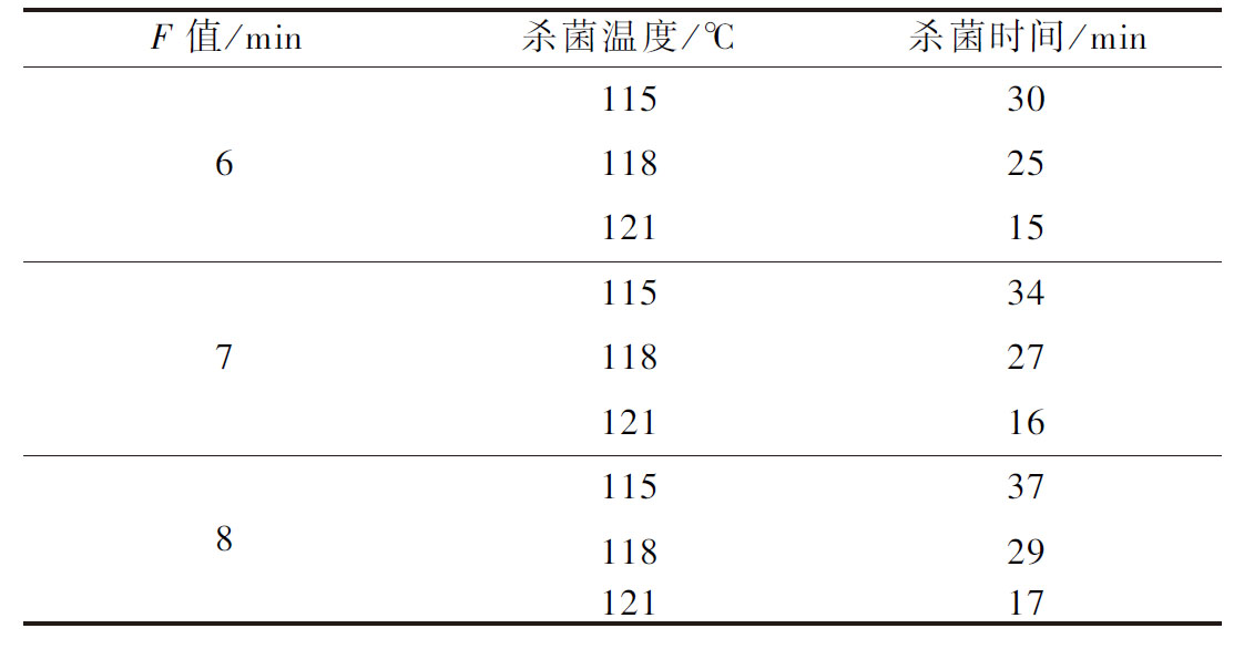 根据计算所得的累计F值得到固定F值为6、7、8 min时,对应115、118、121 ℃的杀菌时间见表2。