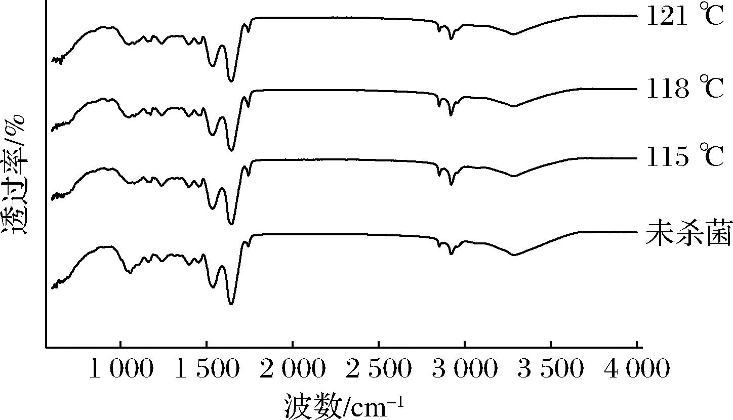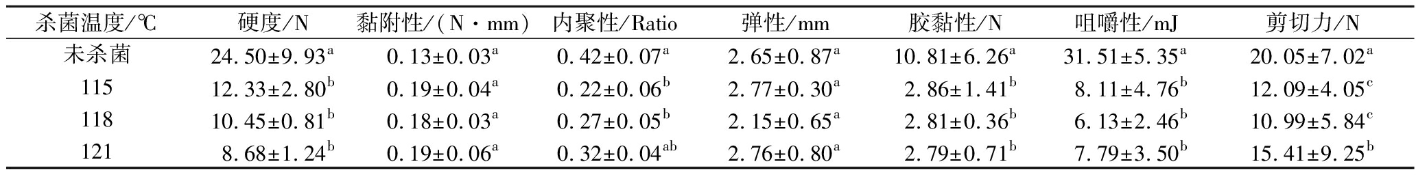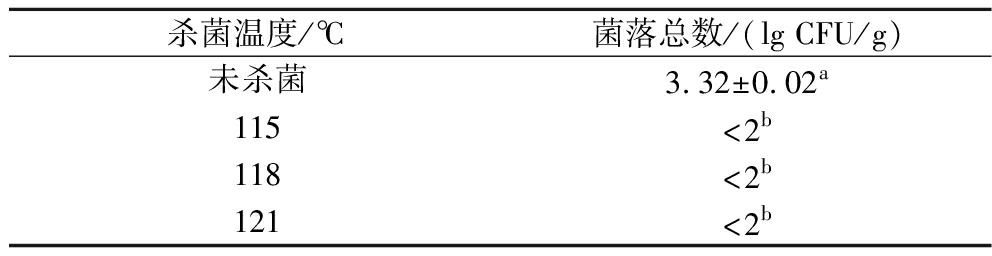 杀菌温度/℃菌落总数/(lg CFU/g)未杀菌3.32±0.02a115<2b118<2b121<2b