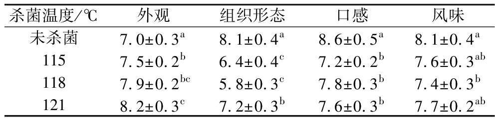 a)对产品的感官评定发现,杀菌后产品在色泽方面有明显的提升,但是口感、滋味和组织形态方面都略有不足,高温杀菌对质构和风味的影响很显著,其中115 ℃口感最差,118 ℃组织形态最不受欢迎,121 ℃时仍具有较好的口感和风味。