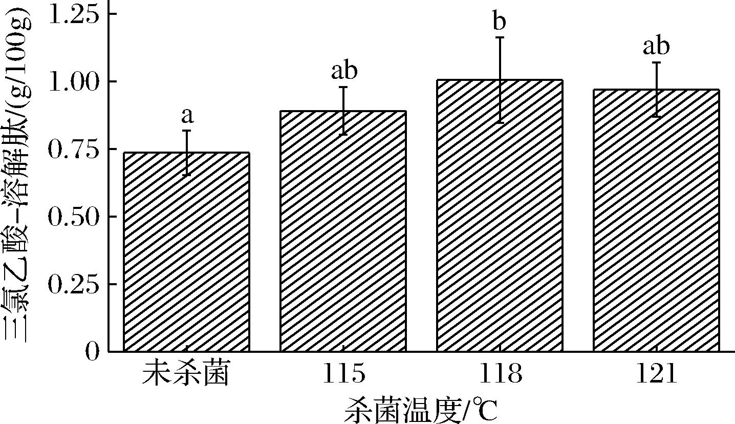 不同杀菌处理下羊排的三氯乙酸-溶解肽含量,根据MAD-ALI等[24]的方法进行测定。精确称量2~3 g切碎后的羊排,加入30 mL 50 g/L三氯乙酸溶液,冰水浴均质2 min后,冰浴60 min,低温离心(4 ℃,10 000 r/min,10 min)后使用双层滤纸过滤。取上清液用BCA法测定三氯乙酸-可溶性肽含量。