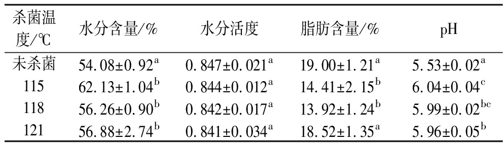 杀菌温度/℃水分含量/%水分活度脂肪含量/%pH未杀菌54.08±0.92a0.847±0.021a19.00±1.21a5.53±0.02a11562.13±1.04b0.844±0.012a14.41±2.15b6.04±0.04c11856.26±0.90b0.842±0.017a13.92±1.24b5.99±0.02bc12156.88±2.74b0.841±0.034a18.52±1.35a5.96±0.05b