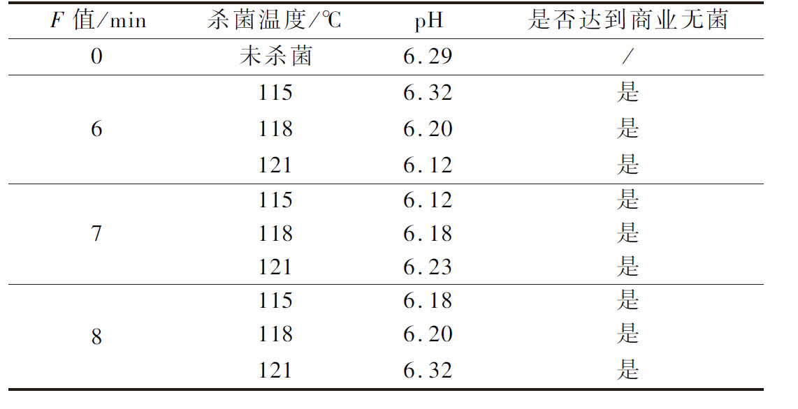 按照国标中的方法进行食品商业无菌的检验(表3),确定安全杀菌F值为6 min,并在后续研究中固定杀菌F值为6 min,对杀菌后产品的品质变化进行检测。
