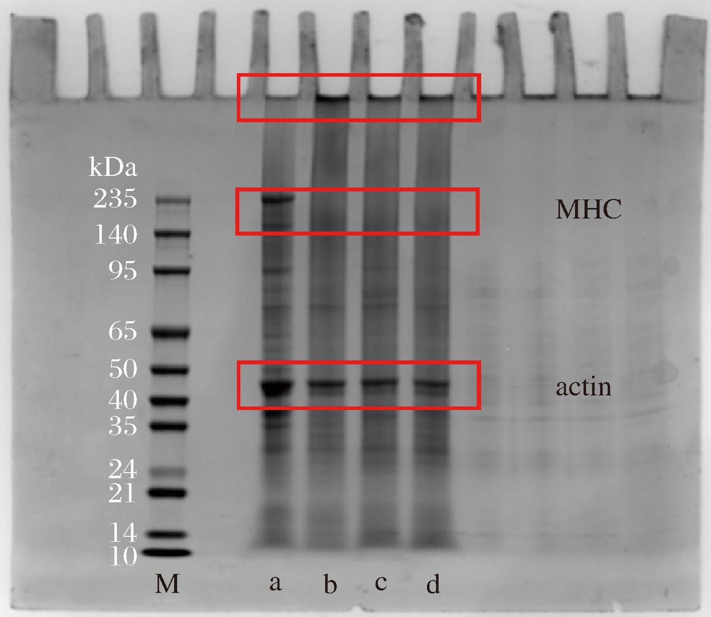使用蛋白质凝胶电泳对不同杀菌条件下的蛋白质分子质量组成进行测定。称取1~2 g切碎后的样品,加入20 mL 50 g/L SDS溶液,均质后于85 ℃水浴2 h,冷却至室温后,稀释并使用BCA法测定蛋白质含量,调整蛋白质浓度。加入5×蛋白电泳上样缓冲液,金属浴加热(100 ℃,15 min)。使用生工生物12%预制胶进行电泳,凝胶染色45 min,脱色12 h后,使用凝胶成像仪拍照。