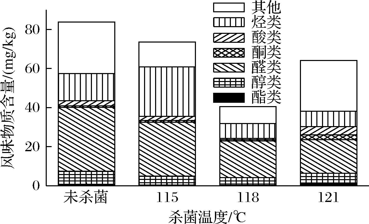 烤羊排产品的风味物质的形成主要包括美拉德反应、脂肪氧化、蛋白质氧化和香辛料的共同作用,其风味物质组成主要包括醛类、酮类、酯类、醇类和酸类[34-35]。杀菌处理会导致风味物质的流失,杀菌后的烤羊排产品风味物质含量有明显的降低,其中118 ℃时风味物质损失最多,由83 mg/kg减少到40 mg/kg(图11)。杀菌后风味物质的流失是因为温度变化导致产品中部分挥发性物质随着水分和脂肪形态的转化一起流出。其中醛类降低最明显,酯类在121 ℃时还略有增加。这与常思盎等[36]的研究结果相一致。此外,风味物质的变化也与加工过程中调味料的添加有关。蚝油中富含氨基酸和还原糖,在热加工的过程中通过美拉德反应生成吡嗪类、呋喃类等挥发性香味物质,具有较高的热稳定性,其中的盐分和核苷酸可以增强肉类蛋白对风味物质的吸附能力[37]。玉米淀粉加热糊化形成的凝胶网络同样可以物理包埋风味物质从而降低其氧化和挥发速率[38]。香辛料中含有多酚、黄酮等抗氧化成分,能抑制热处理过程中脂肪氧化及挥发性风味物质的降解[39]。
