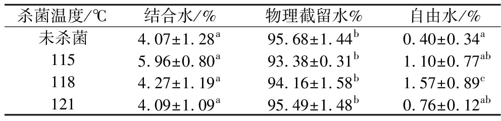 杀菌温度/℃结合水/%物理截留水%自由水/%未杀菌4.07±1.28a95.68±1.44b0.40±0.34a1155.96±0.80a93.38±0.31b1.10±0.77ab1184.27±1.19a94.16±1.58b1.57±0.89c1214.09±1.09a95.49±1.48b0.76±0.12ab