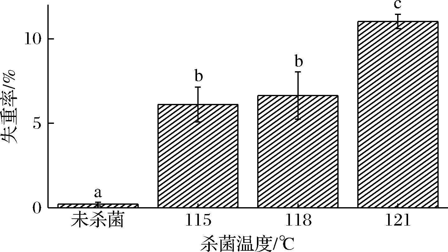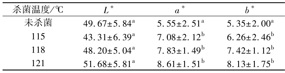 杀菌温度/℃L∗a∗b∗未杀菌49.67±5.84a5.55±2.51a5.35±2.00a11543.31±6.39a7.08±2.12b6.26±2.46b11848.20±5.04a7.83±1.49b7.42±1.12b12151.68±5.81a8.61±1.51b8.13±1.75b