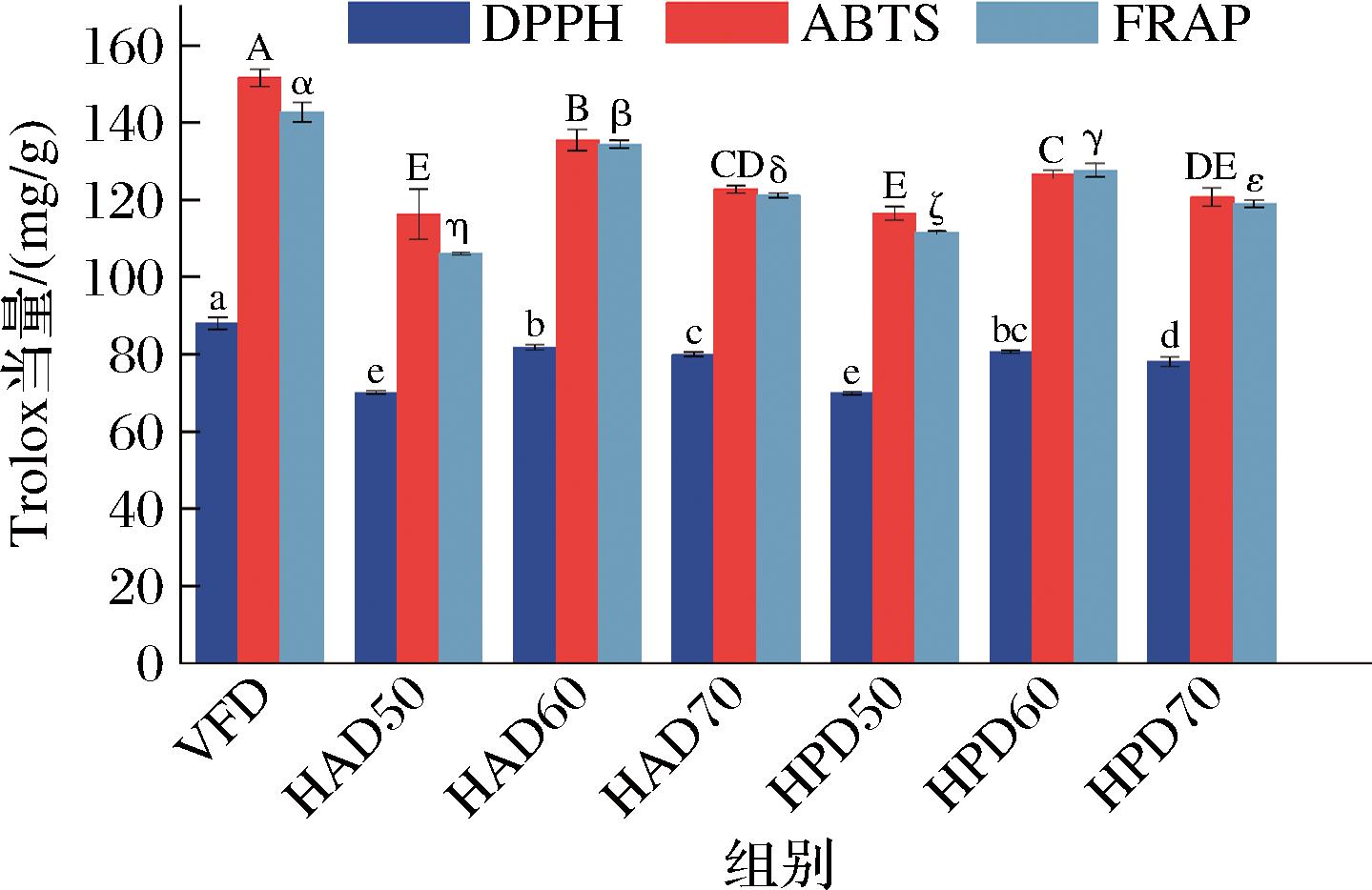DPPH、ABTS和FRAP分别针对不同的抗氧化机制,DPPH法主要检测自由基清除能力,ABTS法检测的是电子转移能力,FRAP法则检测铁离子还原能力,能够从不同角度评估样品抗氧化活性[30]。因此,同一样品不同评估方法测定的抗氧化活性存在差异(图6)。VFD组DPPH(88.0 mg/g)、ABTS(151.6 mg/g)、FRAP(142.7 mg/g)的抗氧化活性均显著高于HAD与HPD组,这是因为HAD与HPD组在干燥过程中会激活PPO等氧化酶且热敏性抗氧化物质会因温度发生降解[31]。此外,HAD和HPD两种干燥方式下,60 ℃干燥制备样品抗氧化活性均高于其他温度,且HAD60组的抗氧化活性显著高于HPD60组。进一步分析发现,HAD与HPD组随着温度的升高,其抗氧化性呈现与总酚、总黄酮含量同步的“先上升再下降”变化趋势,这是因为酚类和黄酮类化合物中酚羟基结构里的邻位酚羟基很容易被氧化成醌类结构,导致其对活性氧等自由基具有很强的捕捉能力[32],这也让植物源多酚和黄酮成为抗氧化作用的重要功能成分及主要贡献因子[31,33],因而样品抗氧化性与总酚、总黄酮含量的趋势一致。