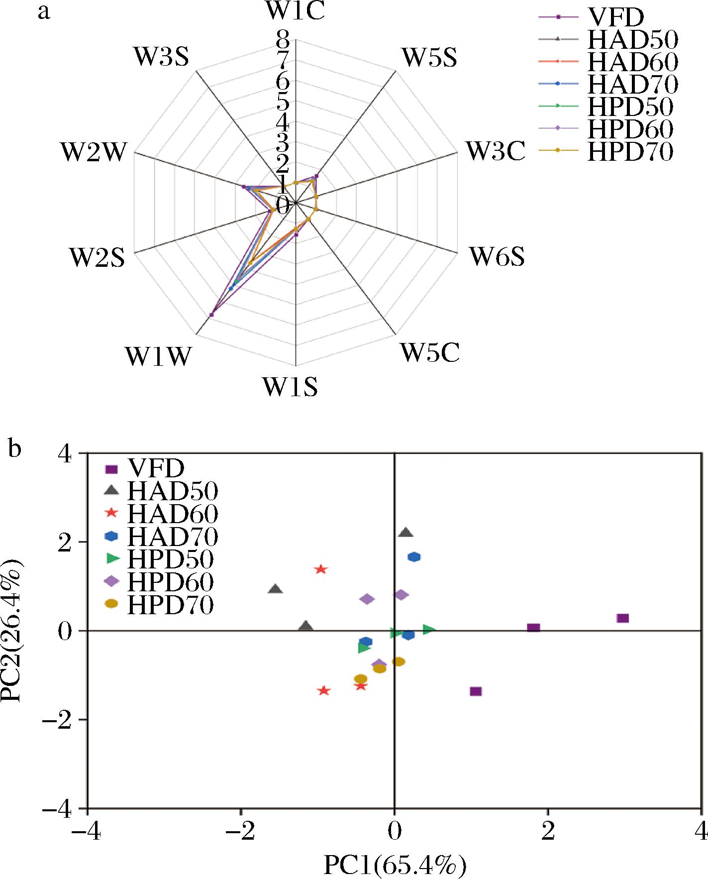 如图7-a所示,桑葚渣粉的挥发性香气成分主要被W1W、W2W和W5S 3个传感器识别,如表1所示,3个传感器分别对应硫化物、有机硫化物、氮氧化合物。7组不同干燥条件下桑葚渣粉的风味轮廓大致相同,但响应程度有所差异,VFD组的W1W、W2W、W5S响应值均大于其他6组,表明冷冻干燥可以有效保留桑葚渣的风味,这是由于VFD较低的温度和真空环境,减少了因温度引起的氧化、降解和酶促反应,能更好地保留风味[34]。对比不同HAD和HDP组发现,在硫化物、有机硫化物的保留上HAD70组最接近VFD组,可能因为HAD70组干燥时间相对较短,且干燥过程中无HPD的强制循环排湿,风味成分逸散减少。