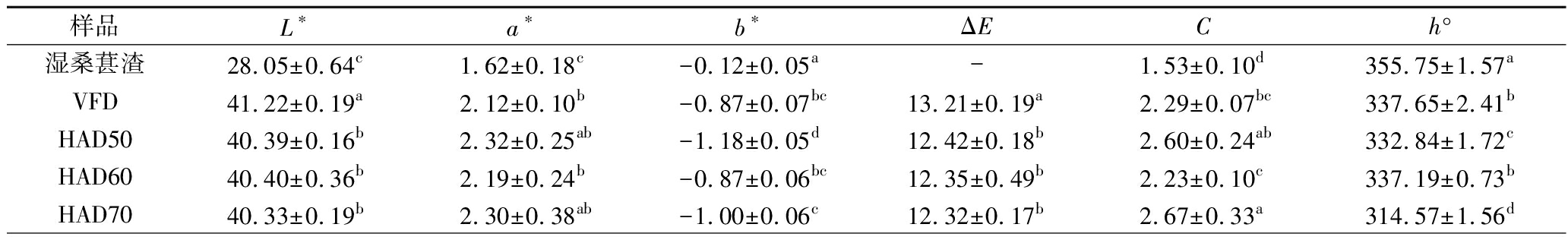 样品L∗a∗b∗ΔECh°湿桑葚渣28.05±0.64c1.62±0.18c-0.12±0.05a-1.53±0.10d355.75±1.57aVFD41.22±0.19a2.12±0.10b-0.87±0.07bc13.21±0.19a2.29±0.07bc337.65±2.41bHAD5040.39±0.16b2.32±0.25ab-1.18±0.05d12.42±0.18b2.60±0.24ab332.84±1.72cHAD6040.40±0.36b2.19±0.24b-0.87±0.06bc12.35±0.49b2.23±0.10c337.19±0.73bHAD7040.33±0.19b2.30±0.38ab-1.00±0.06c12.32±0.17b2.67±0.33a314.57±1.56d