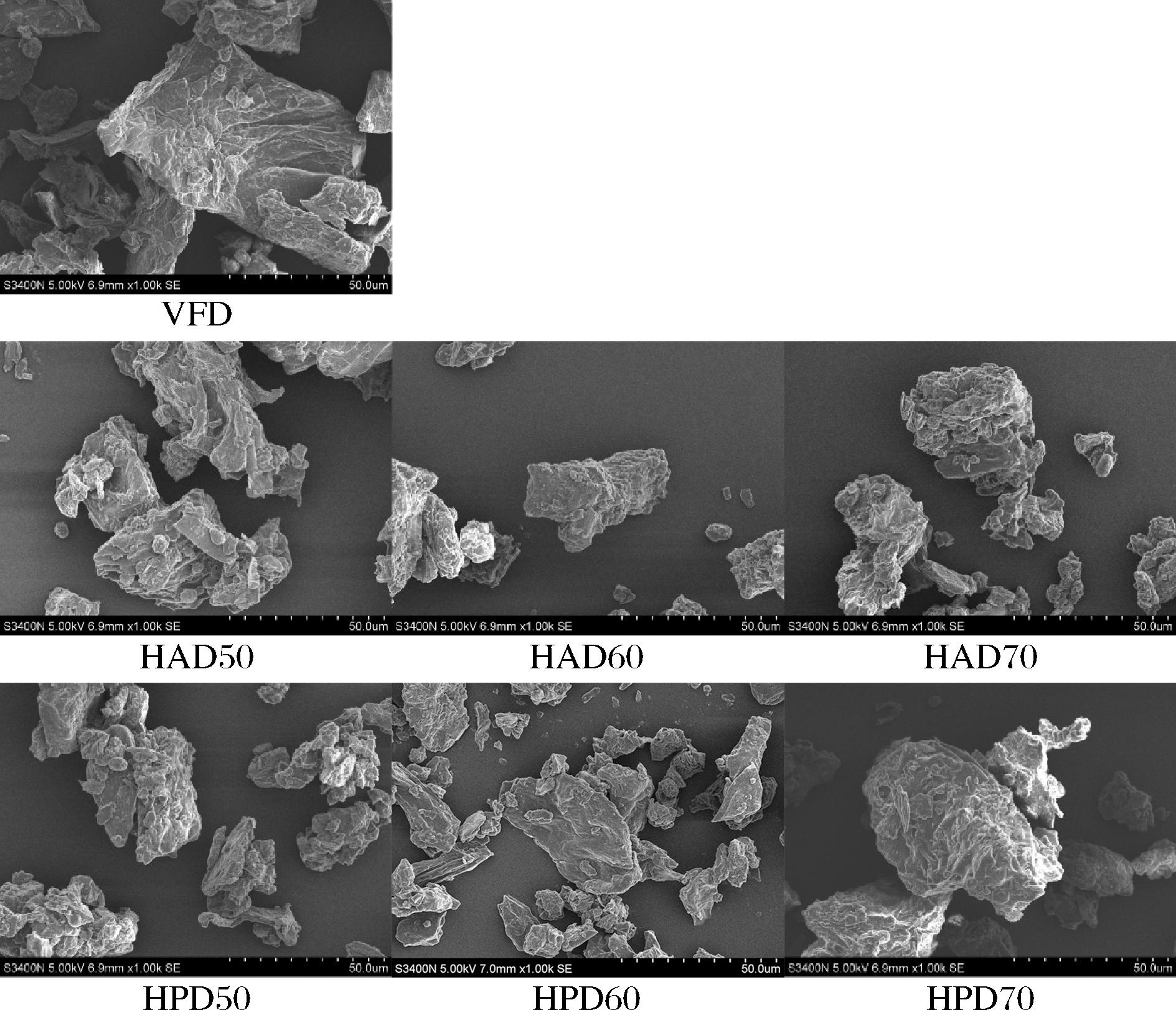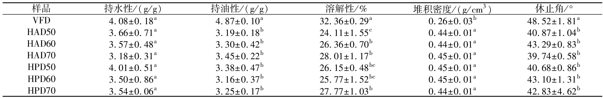 样品持水性/(g/g)持油性/(g/g)溶解性/%堆积密度/(g/cm3)休止角/°VFD4.08±0.18a4.87±0.10a32.36±0.29a0.26±0.03b48.52±1.81aHAD503.66±0.71a3.19±0.18b24.11±1.55c0.44±0.01a40.87±1.04bHAD603.57±0.48a3.30±0.42b26.36±0.70b0.44±0.01a43.29±0.83bHAD703.18±0.31a3.45±0.22b28.01±1.17b0.45±0.01a39.74±0.58bHPD504.01±0.51a3.38±0.47b26.15±0.48bc0.45±0.01a40.68±0.86bHPD603.50±0.86a3.16±0.37b25.77±1.52bc0.45±0.01a43.10±1.31bHPD703.54±0.06a3.25±0.17b27.77±1.03b0.44±0.01a42.83±4.62b