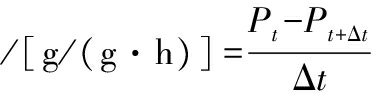 式中:Pt,t时刻的干基含水量,g/g;Pt+Δt,桑葚渣Pt+Δt时刻的干基含水量,g/g;Δt,干燥间隔时间,h。