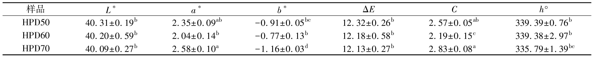 样品L∗a∗b∗ΔECh°HPD5040.31±0.19b2.35±0.09ab-0.91±0.05bc12.32±0.26b2.57±0.05ab339.39±0.76bHPD6040.20±0.59b2.04±0.14b-0.77±0.13b12.18±0.58b2.19±0.15c339.38±2.97bHPD7040.09±0.27b2.58±0.10a-1.16±0.03d12.13±0.27b2.83±0.08a335.79±1.39bc