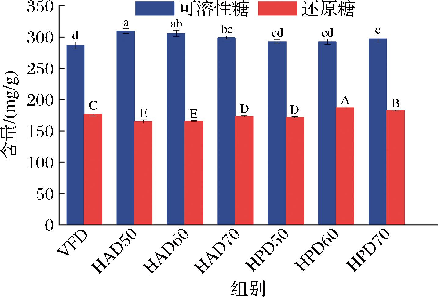 在热干燥过程中桑葚渣还原糖含量是动态变化的,一方面糖类物质的热分解会生成还原糖,另一方面干燥过程因温度和时间的影响会发生不同程度的氧化反应,使还原糖可能被氧化为其他产物,从而降低还原糖含量[25]。如图4所示,HPD60、HPD70组还原糖含量显著高于VFD组(P<0.05),HAD50~HAD70组及HPD50组显著低于VFD组(P<0.05)。这是因为VFD组是在真空和低氧环境下进行干燥,减少了氧化反应带来的还原糖量消耗,同时糖类物质也未受热分解产生还原糖,最终维持基础还原糖水平;HPD60、HPD70组干燥时间较短,减少了氧化反应的时间,因此HPD60、HPD70组还原糖含量较VFD组高,而较高温度(HPD70组)虽加速糖类热解,但同时也会加剧氧化反应,导致HPD70组还原糖含量低于HPD60组。同样地,HAD50~HAD70组及HPD50组因干燥时间长,增加了氧化反应的时间,使其还原糖含量低于VFD组。