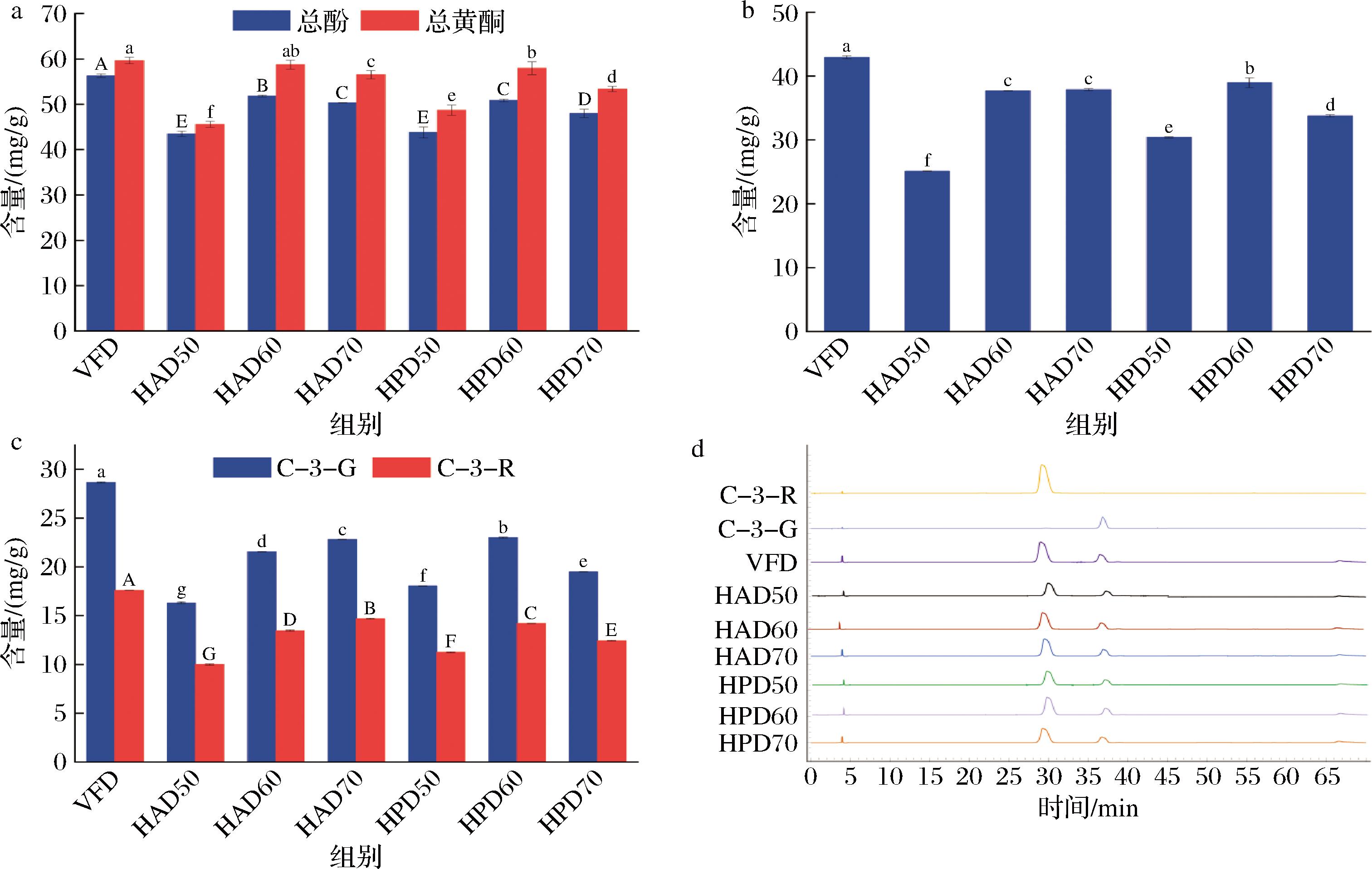 如图5-a所示,VFD组总酚(56.3 mg/g)和总黄酮(59.6 mg/g)的含量最高,显著高于HAD与HPD组(P<0.05),这是由于多酚氧化酶(polyphenol oxidase, PPO)和过氧化物酶(peroxidase, POD)在VFD的低温和真空环境受到抑制[26],有效控制了多酚类物质降解。HAD和HPD组,随着温度的升高,总酚和总黄酮含量均呈现出先上升再下降的趋势,这是由于PPO和POD活性在40~50 ℃时较高,会导致酚类物质降解,60 ℃时PPO活性随着干燥时间的延长逐渐降低;70 ℃时虽PPO和POD活性显著降低,但高温同样会导致酚类物质受热降解[27-28]。总黄酮同样受PPO和POD的影响[29],因此与总酚呈现一致趋势。在同温度下,HAD50组干燥时间长,PPO和POD活性较活跃,使酚类化合物含量较HPD50组低;不同的是,HAD60、HAD70组酚类物质含量分别高于HPD60、HPD70组,这可能是因为HPD60、HPD70组干燥速率较HAD60、HAD70组更快,同时诱导了酚类物质的快速降解,但具体原因仍需进一步探究。整体而言,无论采用HAD还是HPD,均在温度为60 ℃时,桑葚渣中总酚、黄酮含量最高。