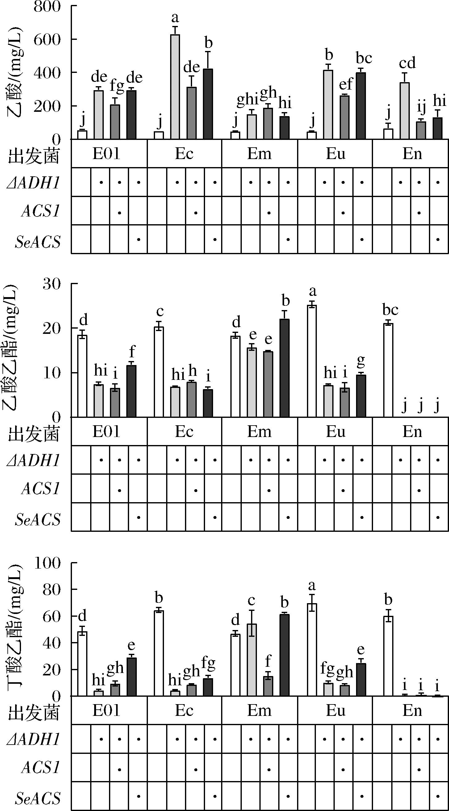 图8 以E01为出发菌的各改造重组菌株的乙酸、乙酸乙酯与丁酸乙酯产量