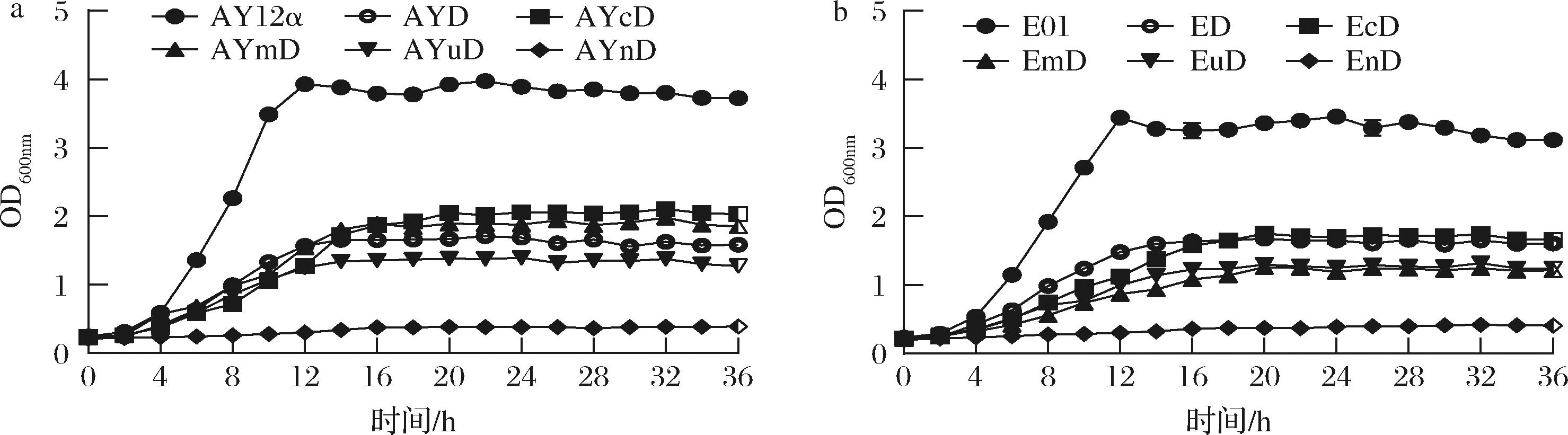 a-AY12α及敲除ADH1后重组菌株的生长曲线;b-E01及敲除ADH1后重组菌株的生长曲线
