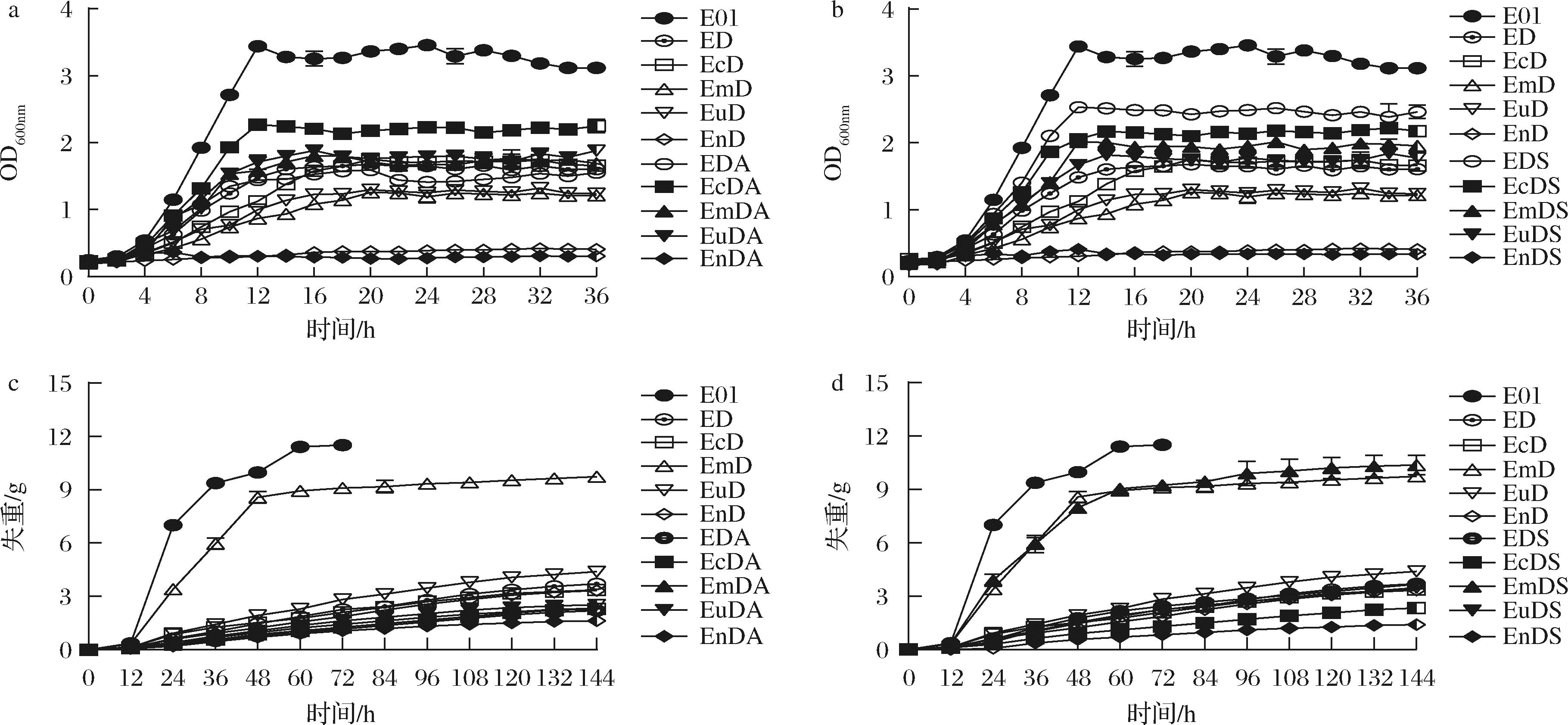 图7 出发菌株和乙酰辅酶A生成途径优化重组菌株生长和发酵失重情况
