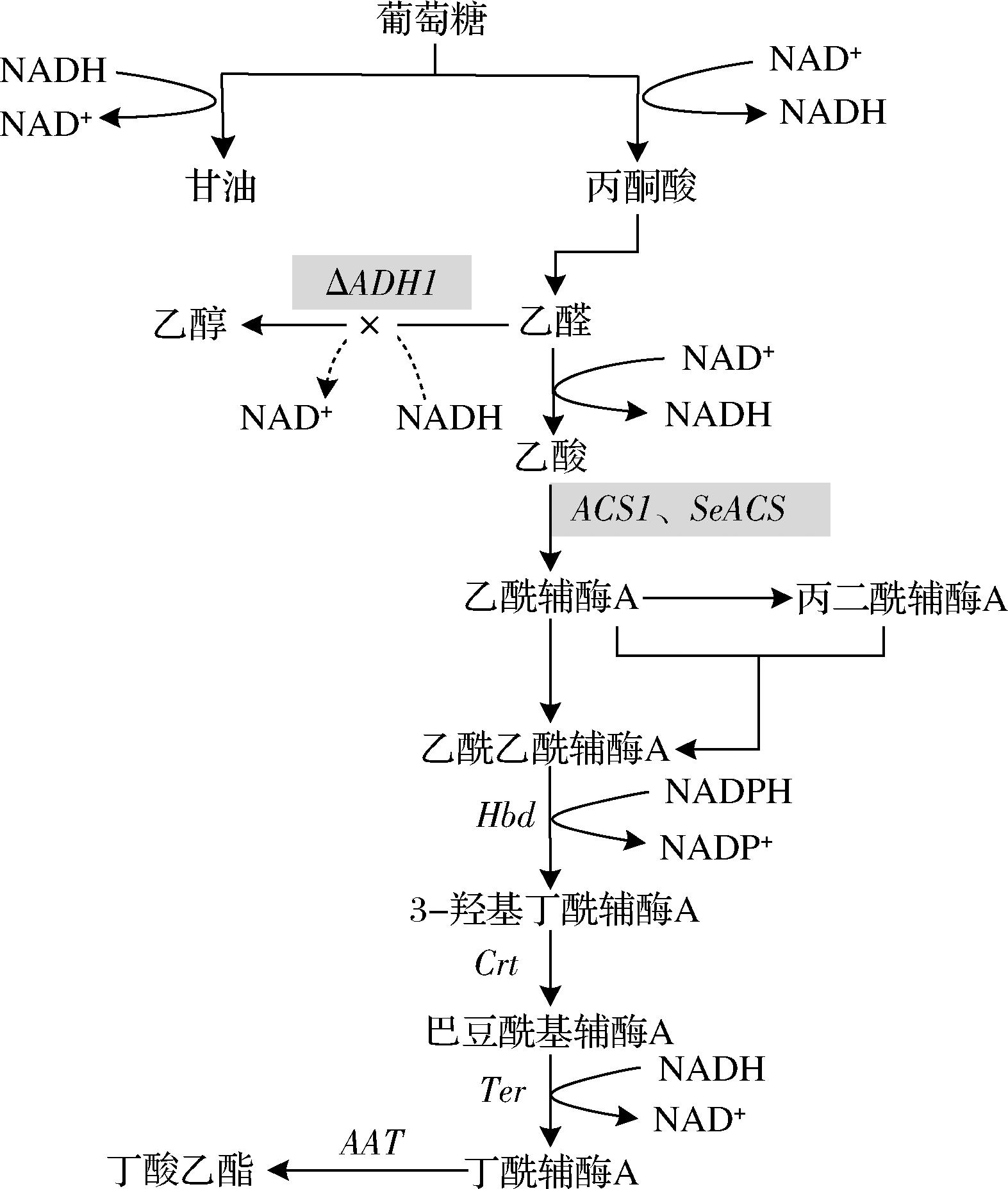 在重组菌株E01中,丁酸乙酯的合成通路和乙醇的代谢通路存在碳流竞争(图1),由葡萄糖代谢而来的乙醛一方面可以后续形成乙酰辅酶A进入逆β-氧化途径完成丁酸乙酯的合成;另一方面,乙醛在乙醇脱氢酶(ADH1为主)的催化下合成乙醇[15]。