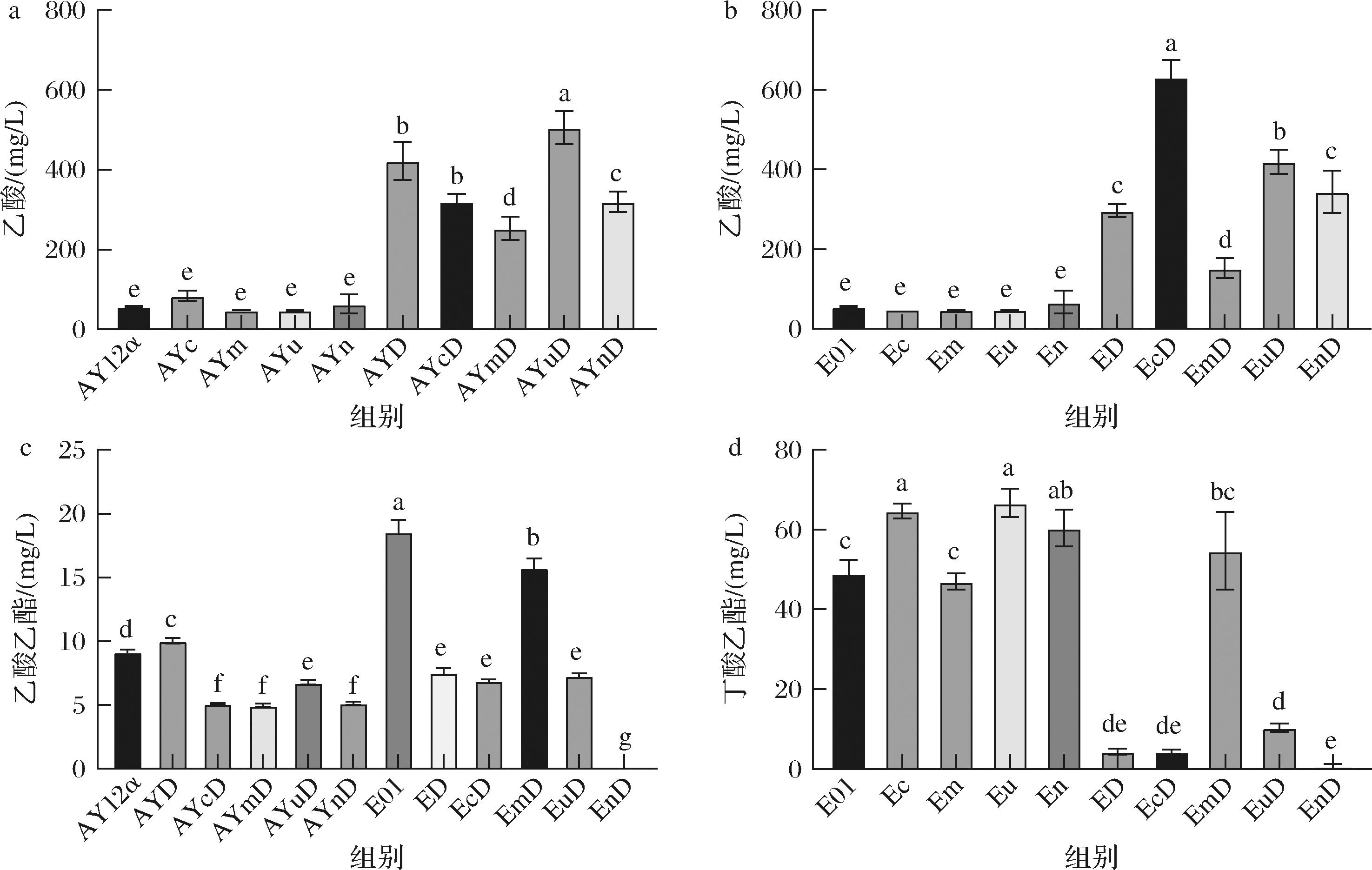 a-AY12α及其改造菌株乙酸产量;b-E01及其改造菌株乙酸产量;c-出发菌株及其改造菌株乙酸乙酯产量;d-E01及其改造菌株丁酸乙酯产量