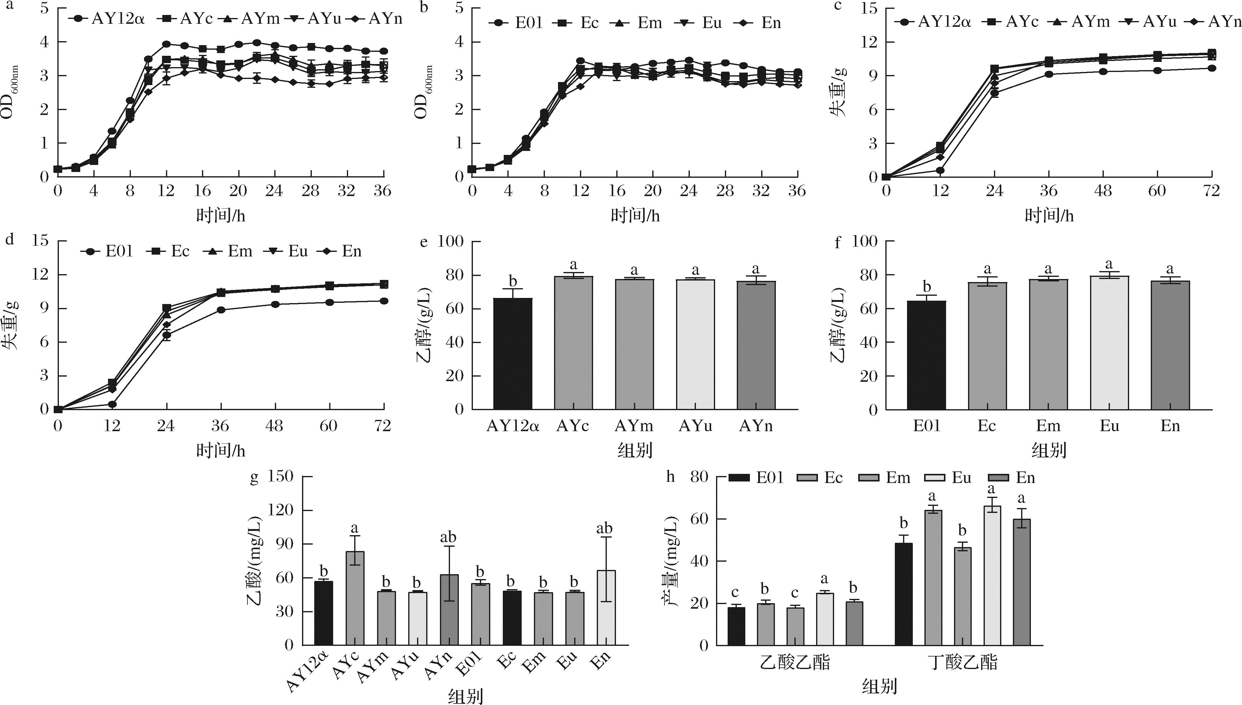 a-AY12α和引入与NADH消耗相关基因后重组菌株的生长曲线;b-E01和重组菌株的生长曲线;c-AY12α和重组菌株CO2排放量;d-E01和重组菌株CO2排放量;e-AY12α和重组菌株的乙醇产量;f-E01和重组菌株的乙醇产量;g-出发菌和重组菌株的乙酸产量;h-E01和重组菌株的乙酸乙酯、丁酸乙酯产量