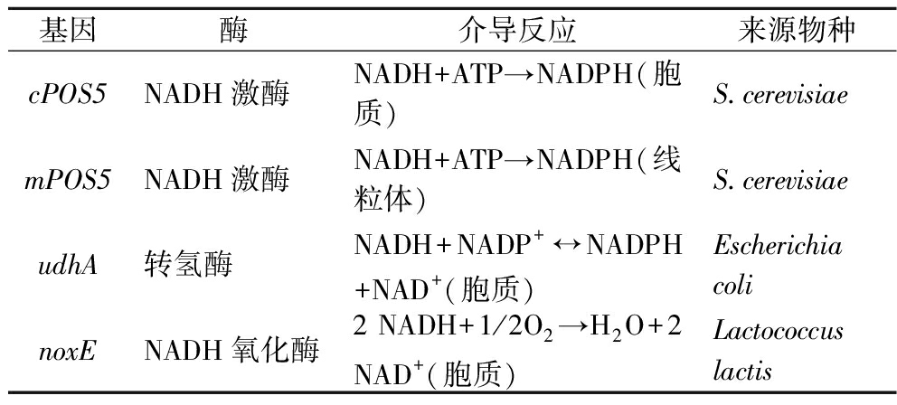 基因酶介导反应来源物种cPOS5NADH激酶NADH+ATP→NADPH(胞质)S.cerevisiaemPOS5NADH激酶NADH+ATP→NADPH(线粒体)S.cerevisiaeudhA转氢酶NADH+NADP+↔NADPH+NAD+(胞质)Escherichia colinoxENADH氧化酶2 NADH+1/2O2→H2O+2 NAD+(胞质)Lactococcus lactis