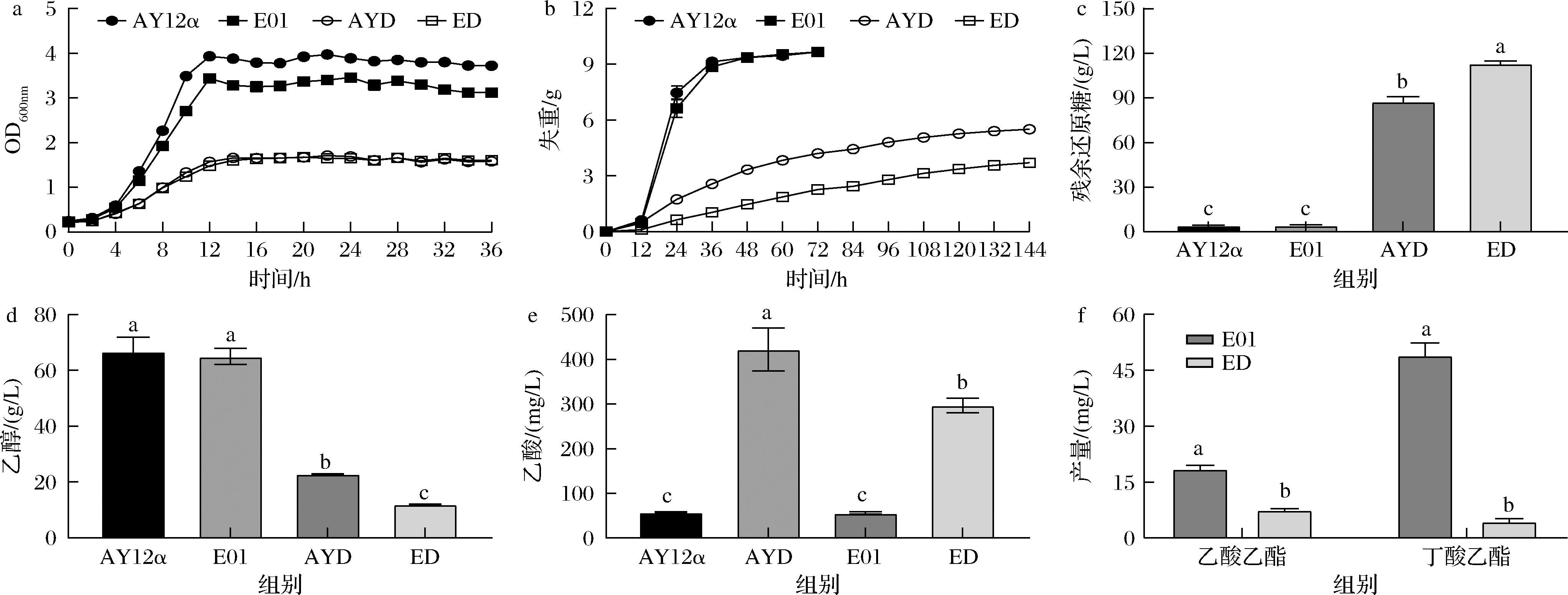 a-生长曲线;b-CO2排放量;c-残余还原糖;d-乙醇产量;e-乙酸产量;f-乙酸乙酯、丁酸乙酯产量