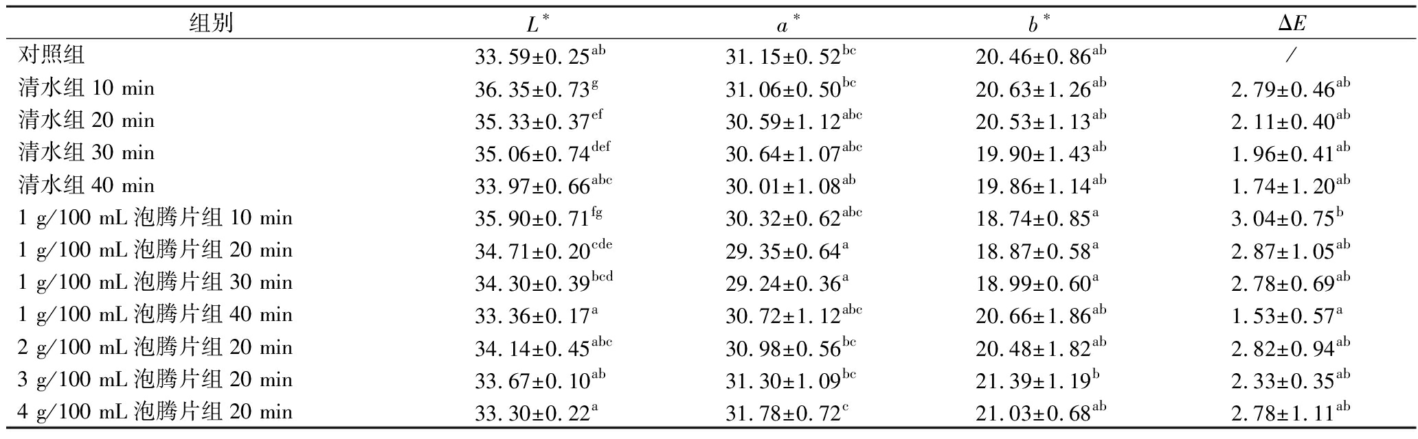 组别L∗a∗b∗ΔE对照组33.59±0.25ab31.15±0.52bc20.46±0.86ab/清水组10 min36.35±0.73g31.06±0.50bc20.63±1.26ab2.79±0.46ab清水组20 min35.33±0.37ef30.59±1.12abc20.53±1.13ab2.11±0.40ab清水组30 min35.06±0.74def30.64±1.07abc19.90±1.43ab1.96±0.41ab清水组40 min33.97±0.66abc30.01±1.08ab19.86±1.14ab1.74±1.20ab1 g/100 mL泡腾片组10 min35.90±0.71fg30.32±0.62abc18.74±0.85a3.04±0.75b1 g/100 mL泡腾片组20 min34.71±0.20cde29.35±0.64a18.87±0.58a2.87±1.05ab1 g/100 mL泡腾片组30 min34.30±0.39bcd29.24±0.36a18.99±0.60a2.78±0.69ab1 g/100 mL泡腾片组40 min33.36±0.17a30.72±1.12abc20.66±1.86ab1.53±0.57a2 g/100 mL泡腾片组20 min34.14±0.45abc30.98±0.56bc20.48±1.82ab2.82±0.94ab3 g/100 mL泡腾片组20 min33.67±0.10ab31.30±1.09bc21.39±1.19b2.33±0.35ab4 g/100 mL泡腾片组20 min33.30±0.22a31.78±0.72c21.03±0.68ab2.78±1.11ab