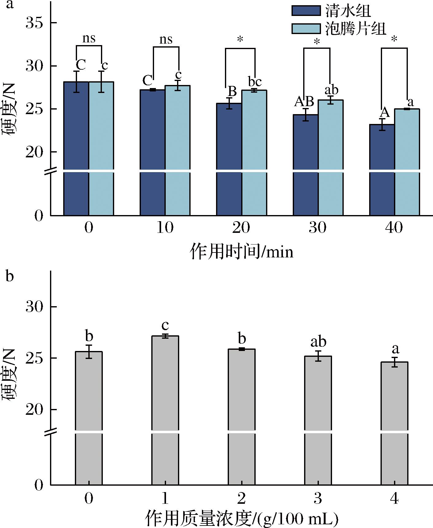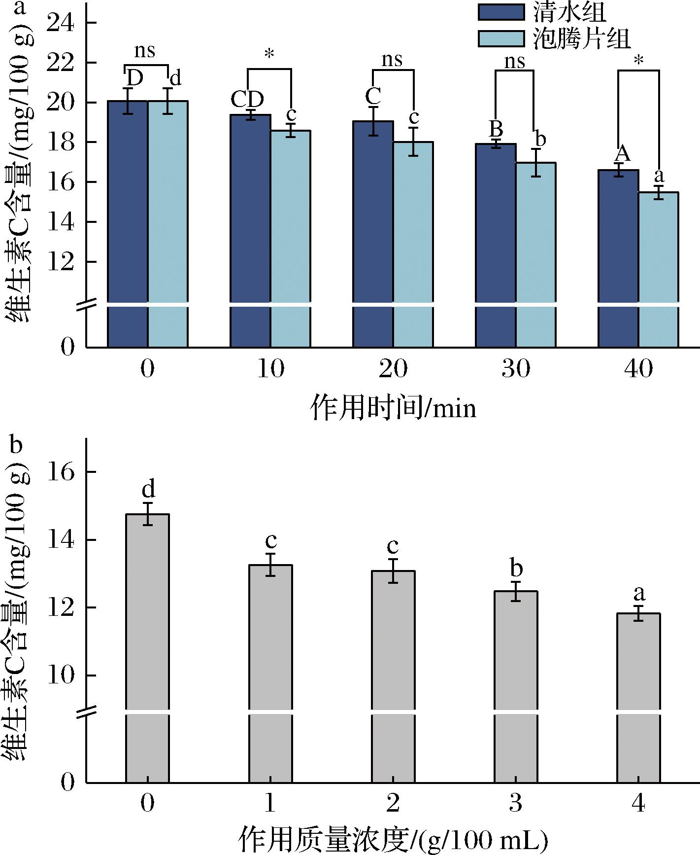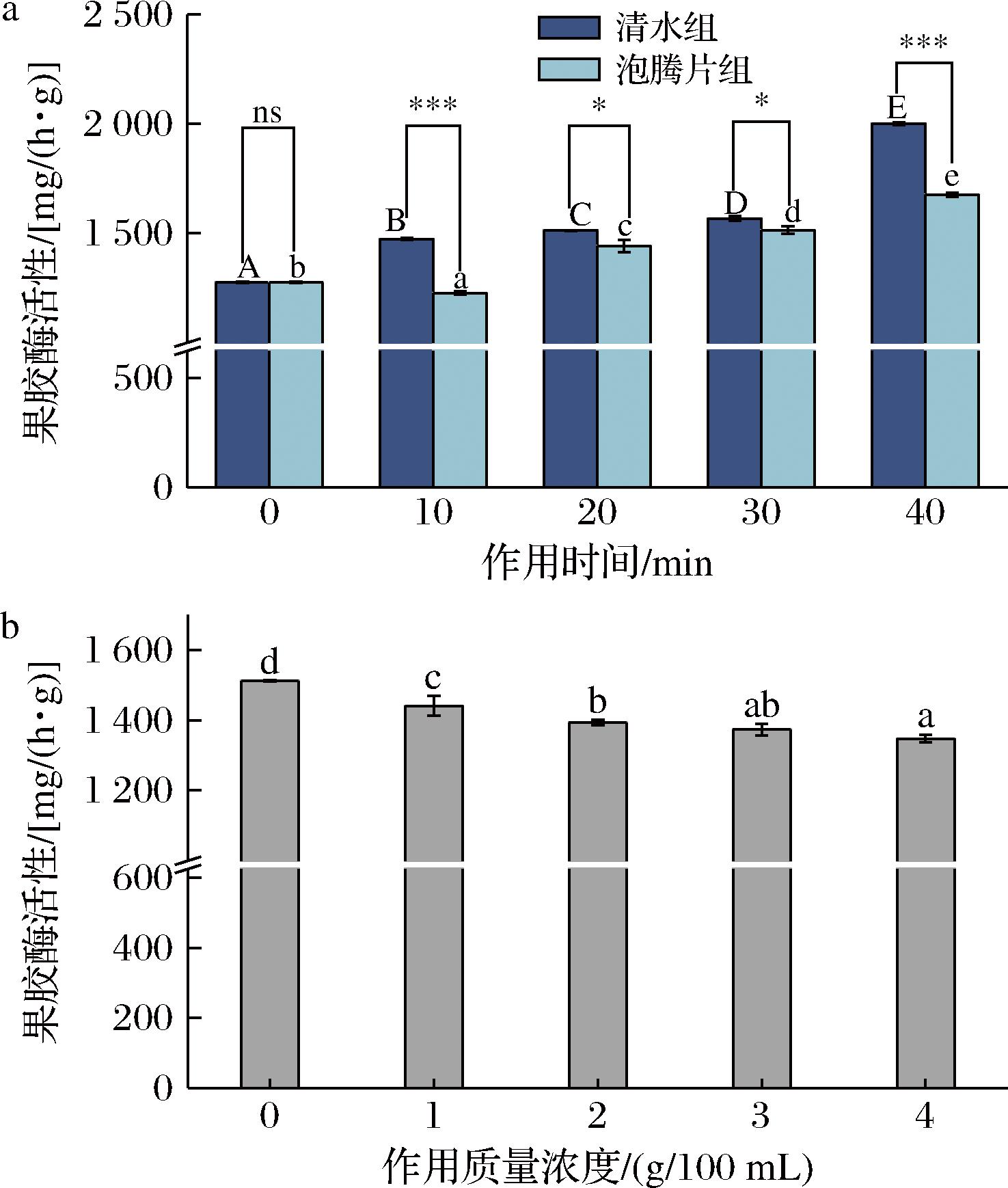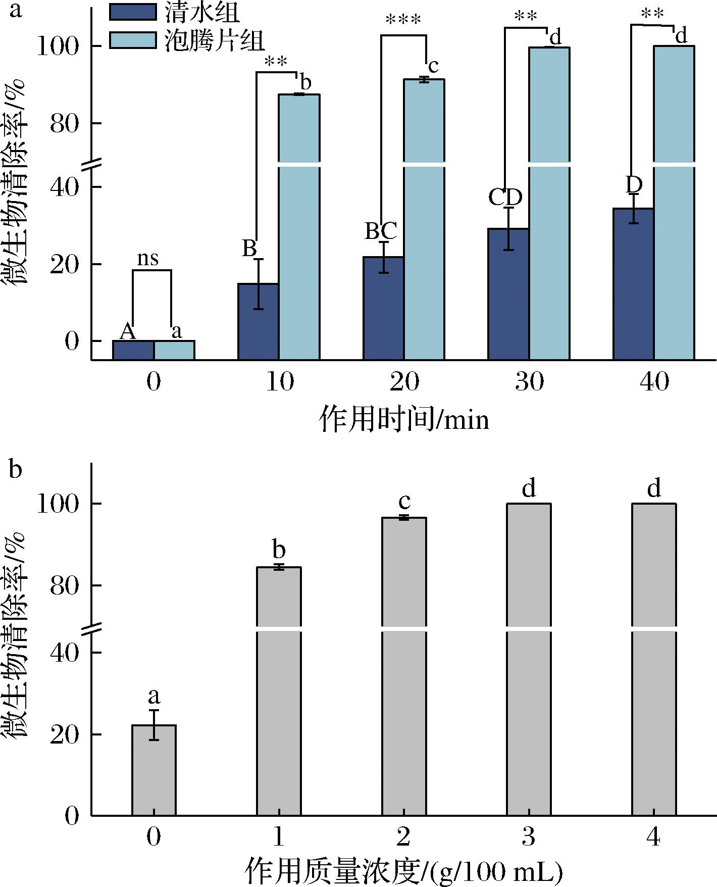 注:不同大写字母表示清水组内,不同小写字母表示泡腾片组内,*表示清水组和泡腾片组间,均具有统计学意义(P<0.05),**表示P<0.01,***表示P<0.001,ns表示无显著差异(下同)。空白对照 组菌落总数<10,无菌落长出,此次检验结果有效。