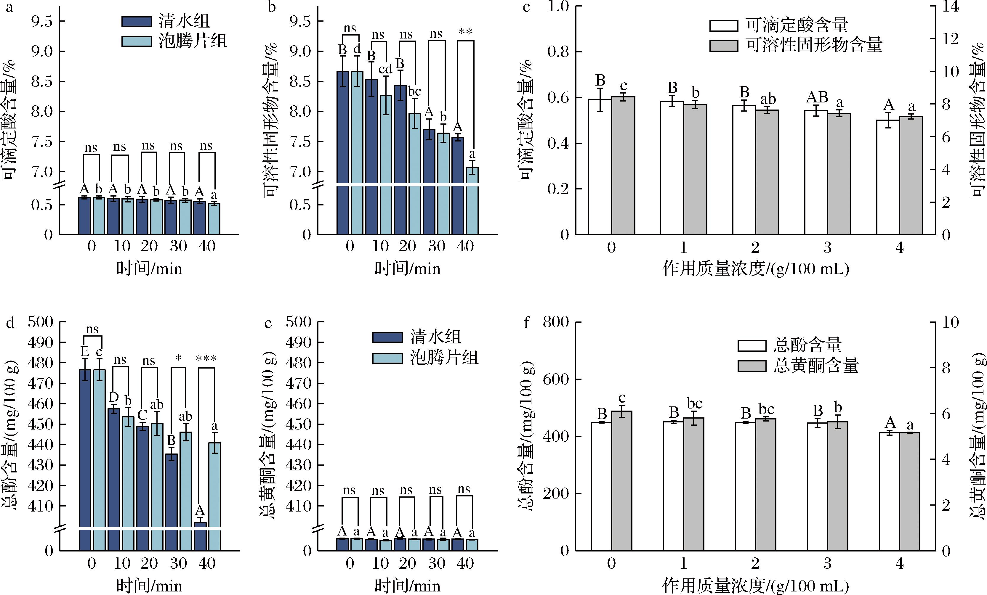 a-作用时间对可滴定酸的影响;b-作用时间对可溶性固形物的影响;c-作用浓度对可滴定酸和可溶性固形物的影响;d-作用时间对总酚的影响;e-作用时间对总黄酮的影响;f-作用浓度对总酚和总黄酮的影响