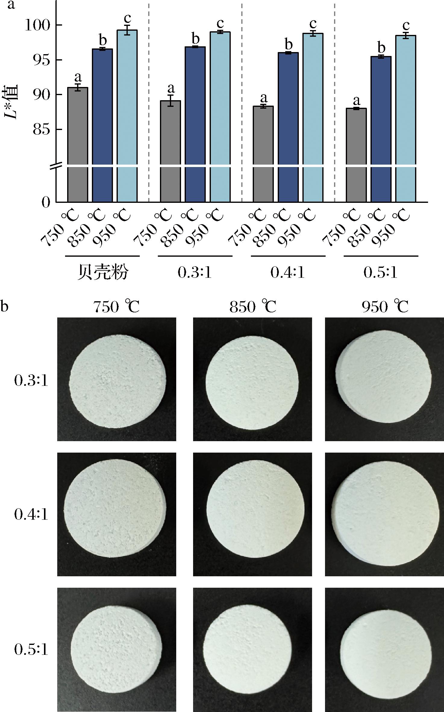泡腾片的色泽和外观是影响其品质的重要指标,贝壳粉作为泡腾片的核心功能组分(占比35%),其明亮度(L*值)直接决定终产品的表观品质。如图3-a所示。随着煅烧温度从750 ℃升至850 ℃,贝壳粉L*值由91.03显著提升至96.57;当温度继续升高至950 ℃,贝壳粉L*值增加至99.27。该结果与邸玲[14]研究得出的煅烧温度对不同种类贝壳粉白度的影响规律相似,原因是800 ℃时,贝壳粉中的CaCO3发生热解生成CaO,CaO呈白色粉末状,造成白度急剧增大。采用相同煅烧温度的贝壳粉为原料时,不同崩解剂比例的泡腾片L*值均无显著性差异。