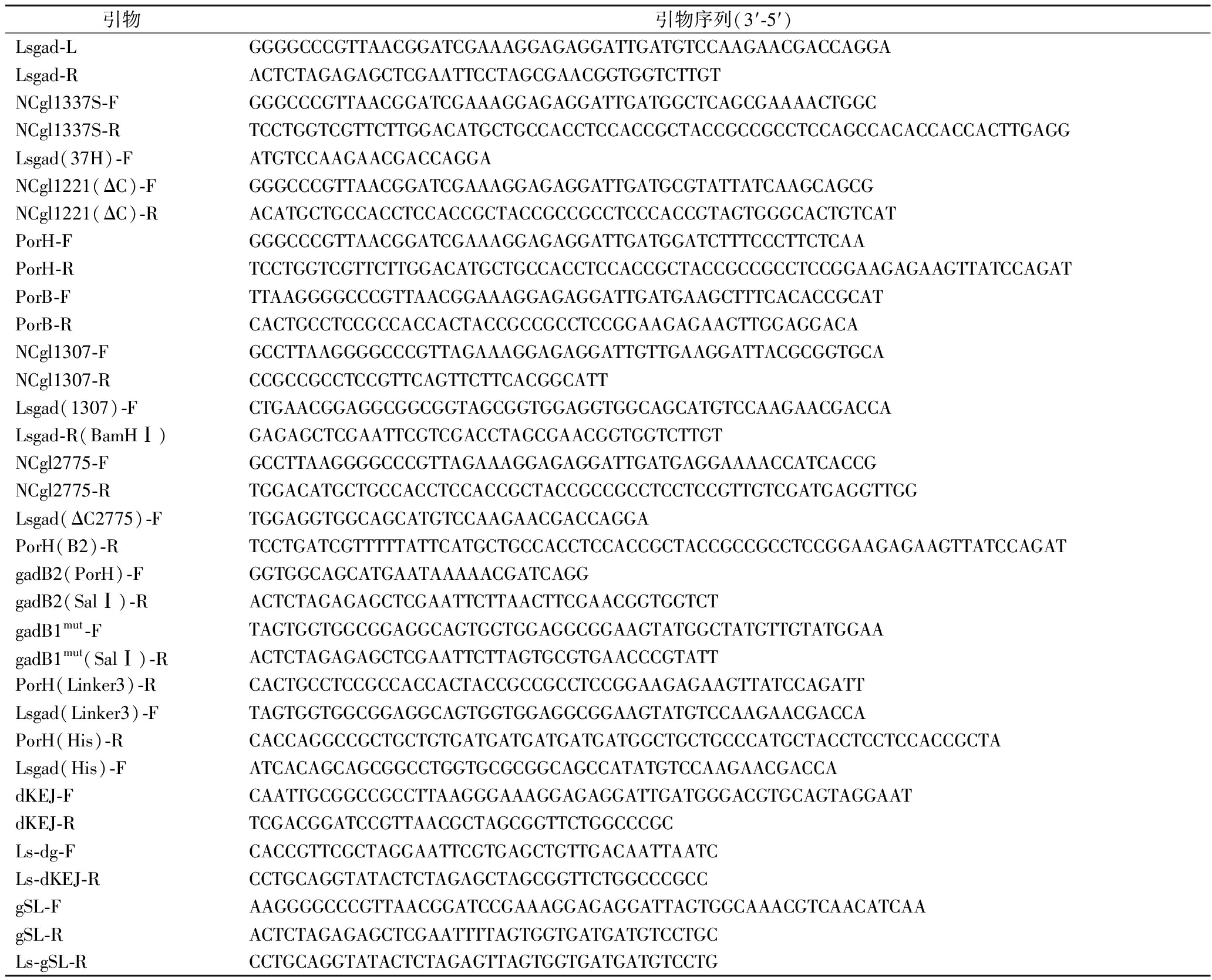 引物引物序列(3′-5′)Lsgad-LGGGGCCCGTTAACGGATCGAAAGGAGAGGATTGATGTCCAAGAACGACCAGGALsgad-RACTCTAGAGAGCTCGAATTCCTAGCGAACGGTGGTCTTGTNCgl1337S-FGGGCCCGTTAACGGATCGAAAGGAGAGGATTGATGGCTCAGCGAAAACTGGCNCgl1337S-RTCCTGGTCGTTCTTGGACATGCTGCCACCTCCACCGCTACCGCCGCCTCCAGCCACACCACCACTTGAGGLsgad(37H)-FATGTCCAAGAACGACCAGGANCgl1221(ΔC)-FGGGCCCGTTAACGGATCGAAAGGAGAGGATTGATGCGTATTATCAAGCAGCGNCgl1221(ΔC)-RACATGCTGCCACCTCCACCGCTACCGCCGCCTCCCACCGTAGTGGGCACTGTCATPorH-FGGGCCCGTTAACGGATCGAAAGGAGAGGATTGATGGATCTTTCCCTTCTCAAPorH-RTCCTGGTCGTTCTTGGACATGCTGCCACCTCCACCGCTACCGCCGCCTCCGGAAGAGAAGTTATCCAGATPorB-FTTAAGGGGCCCGTTAACGGAAAGGAGAGGATTGATGAAGCTTTCACACCGCATPorB-RCACTGCCTCCGCCACCACTACCGCCGCCTCCGGAAGAGAAGTTGGAGGACANCgl1307-FGCCTTAAGGGGCCCGTTAGAAAGGAGAGGATTGTTGAAGGATTACGCGGTGCANCgl1307-RCCGCCGCCTCCGTTCAGTTCTTCACGGCATTLsgad(1307)-FCTGAACGGAGGCGGCGGTAGCGGTGGAGGTGGCAGCATGTCCAAGAACGACCALsgad-R(BamHⅠ)GAGAGCTCGAATTCGTCGACCTAGCGAACGGTGGTCTTGTNCgl2775-FGCCTTAAGGGGCCCGTTAGAAAGGAGAGGATTGATGAGGAAAACCATCACCGNCgl2775-RTGGACATGCTGCCACCTCCACCGCTACCGCCGCCTCCTCCGTTGTCGATGAGGTTGGLsgad(ΔC2775)-FTGGAGGTGGCAGCATGTCCAAGAACGACCAGGAPorH(B2)-RTCCTGATCGTTTTTATTCATGCTGCCACCTCCACCGCTACCGCCGCCTCCGGAAGAGAAGTTATCCAGATgadB2(PorH)-FGGTGGCAGCATGAATAAAAACGATCAGGgadB2(SalⅠ)-RACTCTAGAGAGCTCGAATTCTTAACTTCGAACGGTGGTCTgadB1mut-FTAGTGGTGGCGGAGGCAGTGGTGGAGGCGGAAGTATGGCTATGTTGTATGGAAgadB1mut(SalⅠ)-RACTCTAGAGAGCTCGAATTCTTAGTGCGTGAACCCGTATTPorH(Linker3)-RCACTGCCTCCGCCACCACTACCGCCGCCTCCGGAAGAGAAGTTATCCAGATTLsgad(Linker3)-FTAGTGGTGGCGGAGGCAGTGGTGGAGGCGGAAGTATGTCCAAGAACGACCAPorH(His)-RCACCAGGCCGCTGCTGTGATGATGATGATGATGGCTGCTGCCCATGCTACCTCCTCCACCGCTALsgad(His)-FATCACAGCAGCGGCCTGGTGCGCGGCAGCCATATGTCCAAGAACGACCAdKEJ-FCAATTGCGGCCGCCTTAAGGGAAAGGAGAGGATTGATGGGACGTGCAGTAGGAATdKEJ-RTCGACGGATCCGTTAACGCTAGCGGTTCTGGCCCGCLs-dg-FCACCGTTCGCTAGGAATTCGTGAGCTGTTGACAATTAATCLs-dKEJ-RCCTGCAGGTATACTCTAGAGCTAGCGGTTCTGGCCCGCCgSL-FAAGGGGCCCGTTAACGGATCCGAAAGGAGAGGATTAGTGGCAAACGTCAACATCAAgSL-RACTCTAGAGAGCTCGAATTTTAGTGGTGATGATGTCCTGCLs-gSL-RCCTGCAGGTATACTCTAGAGTTAGTGGTGATGATGTCCTG