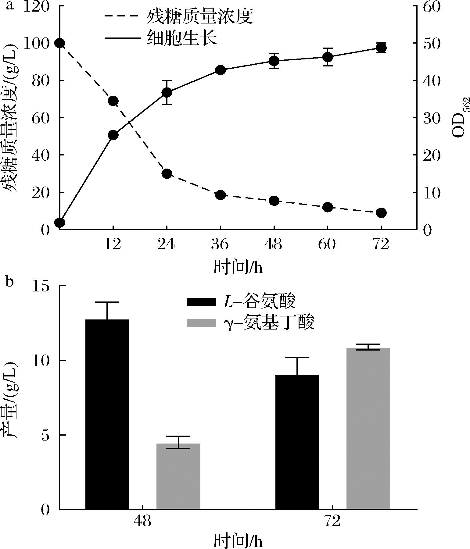 在调节pH的发酵方式下进行摇瓶培养,结果表明,菌株G1-HL生长良好,葡萄糖在72 h后基本消耗殆尽(图6-a)。在48~72 h,L-谷氨酸的含量由12.8 g/L降低至9.1 g/L,GABA的含量从4.5 g/L增加至10.9 g/L(图6-b)。L-谷氨酸在发酵过程中不断被转化为GABA。与在野生型ATCC 13032中表达p5-porHL-gad的菌株G-HL(9.9 g/L GABA)相比(图4-c),最终的GABA产量有所提高。与之前的研究结果[5-6]一致,pknG和gabP基因的缺失能改善GABA的生产。